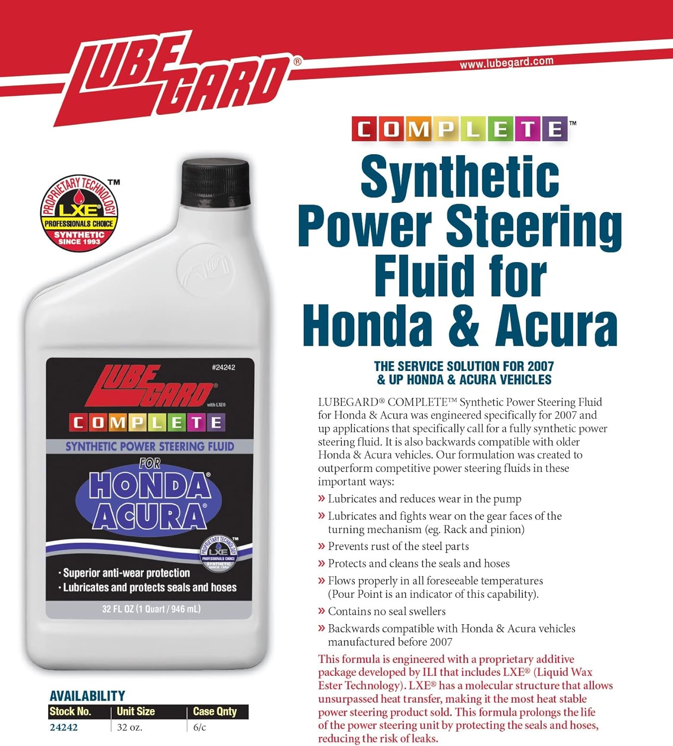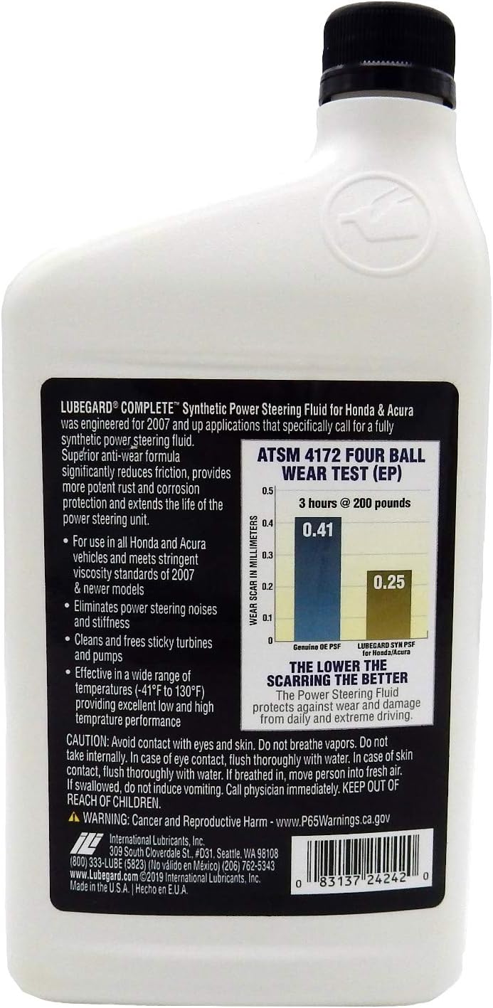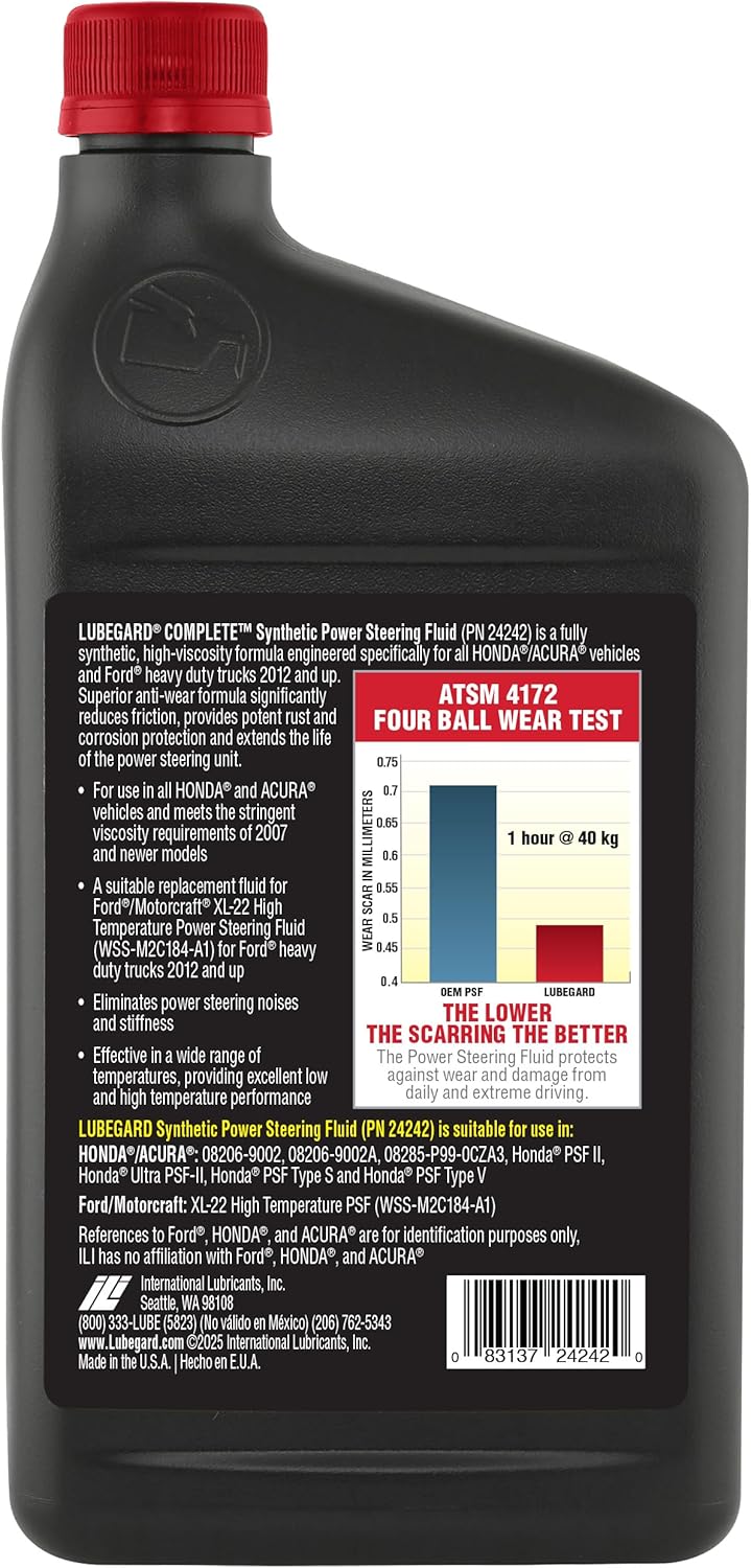 O Lubegard COMPLETE possui dimensões de 5,41 x 10,8 x 22,56 cm e pesa 861,83 g. Produzido com material sintético de alta qualidade, atende rigorosamente às especificações OEM, sendo indicado para veículos com o número de peça Honda 08206-9002. Essa compatibilidade garante uma aplicação perfeita em sistemas de direção hidráulica Honda e Acura. O modelo 24242 do fabricante Lubegard conta com uma fórmula que não utiliza baterias e está disponível no mercado desde janeiro de 2020.