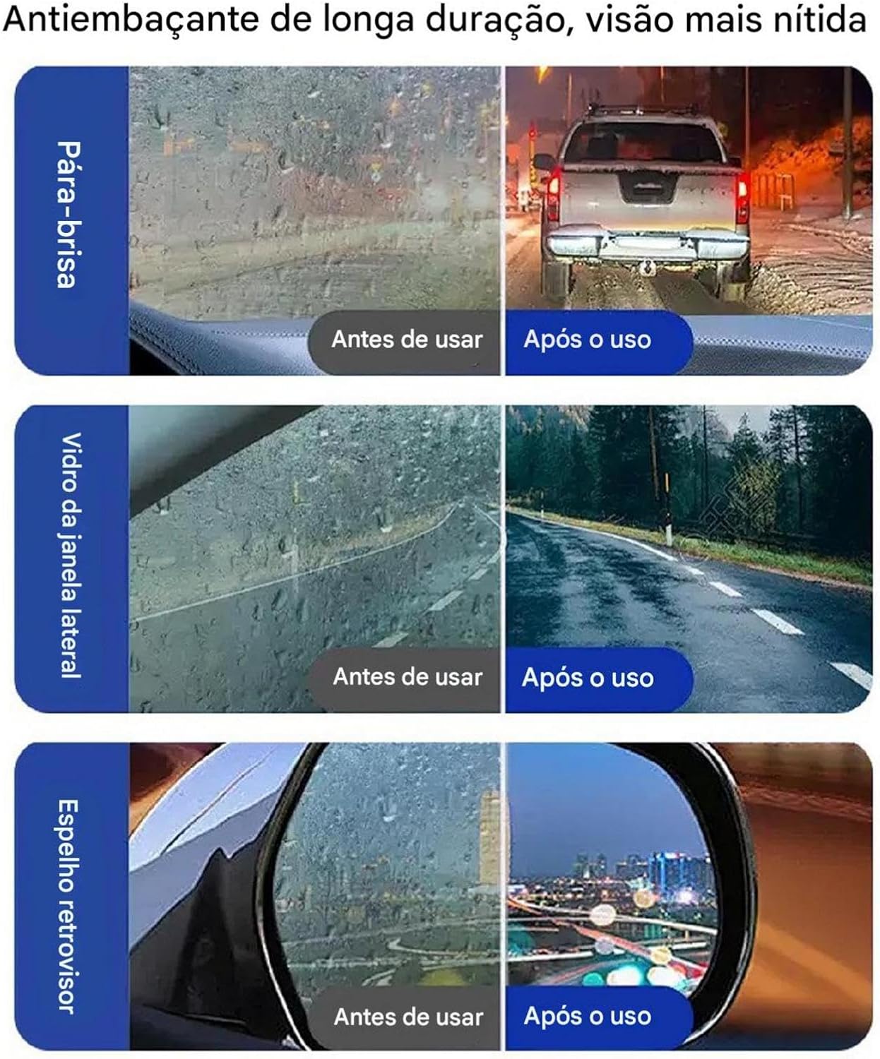 O processo de aplicação é simples e eficiente, permitindo que qualquer motorista proteja seus vidros em poucos instantes. Ao aplicar o produto, você elimina o incômodo do embaçamento frequente, aumentando sua segurança e evitando distrações ao volante durante trajetos sob condições climáticas desafiadoras.
