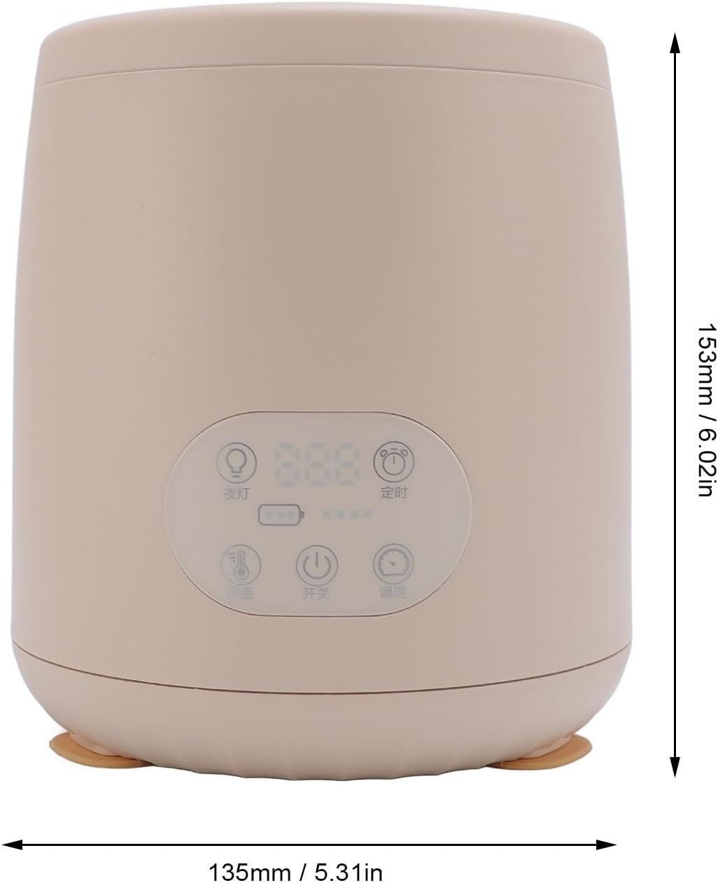 O agitador é fabricado em ABS e silicone de alta durabilidade, pesando aproximadamente 600g. Compatível com garrafas de 50 a 75mm de diâmetro, ele possui dimensões compactas de 17,98 x 15,98 x 15,98 cm, facilitando o armazenamento em qualquer cozinha. O tempo de mistura pode ser configurado em intervalos de 60, 120, 180, 240 ou 300 segundos.
