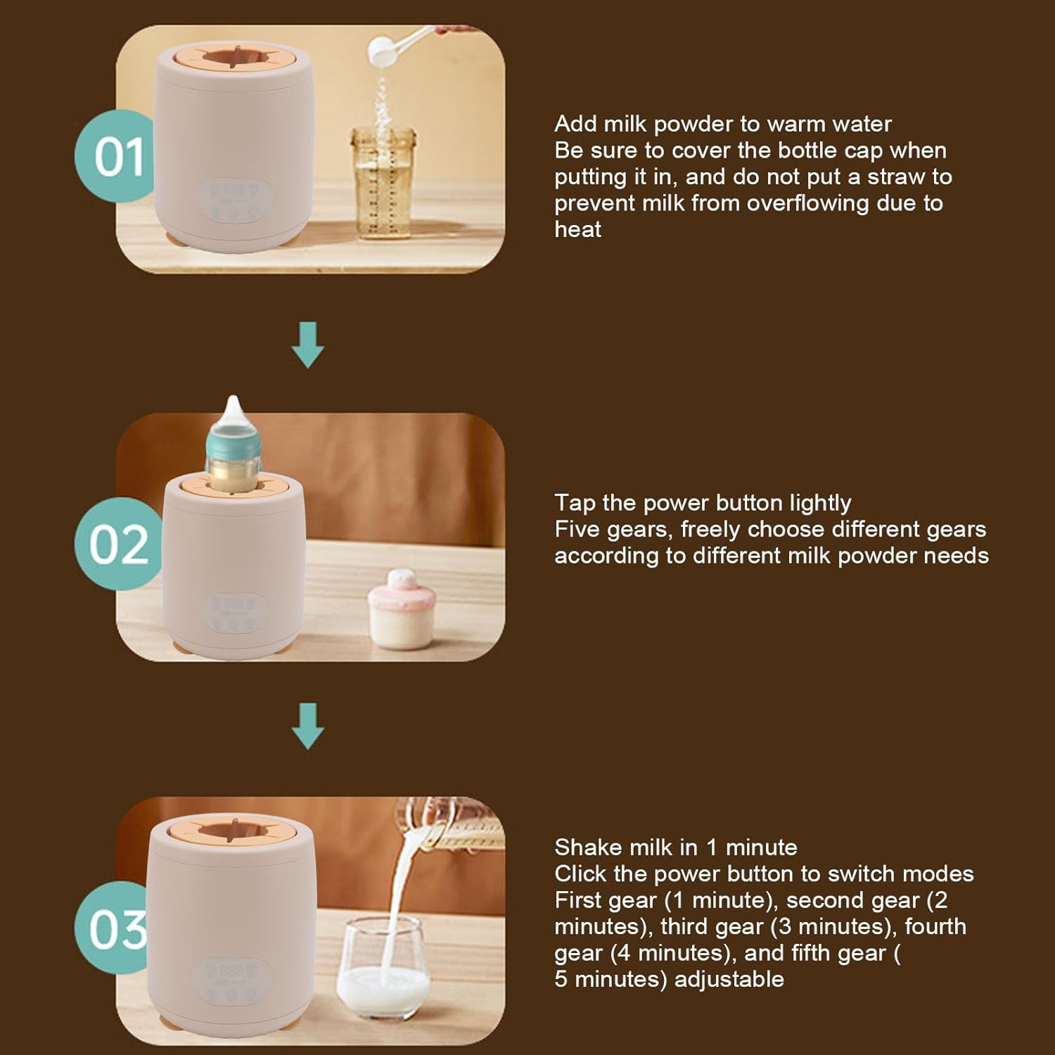 Equipado com três modos de mistura e quatro velocidades ajustáveis, este shaker de garrafa de bebê permite personalizar o preparo de acordo com a necessidade. Com cinco opções de temporizador, você garante que as bebidas fiquem prontas exatamente no ponto desejado de maneira automática.
