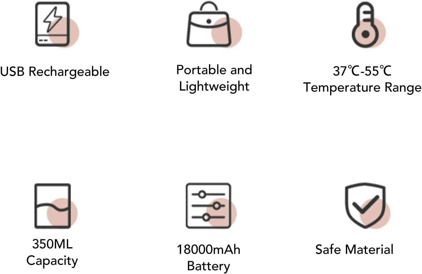 Para garantir a máxima durabilidade, o produto é construído com materiais seguros e protegidos, como aço inoxidável de qualidade alimentar, vidro resistente ao calor e ABS. Sua bateria de alta capacidade, com 18.000 mAh, proporciona um aquecimento de longa duração, ideal para manter líquidos aquecidos durante viagens longas ou passeios.