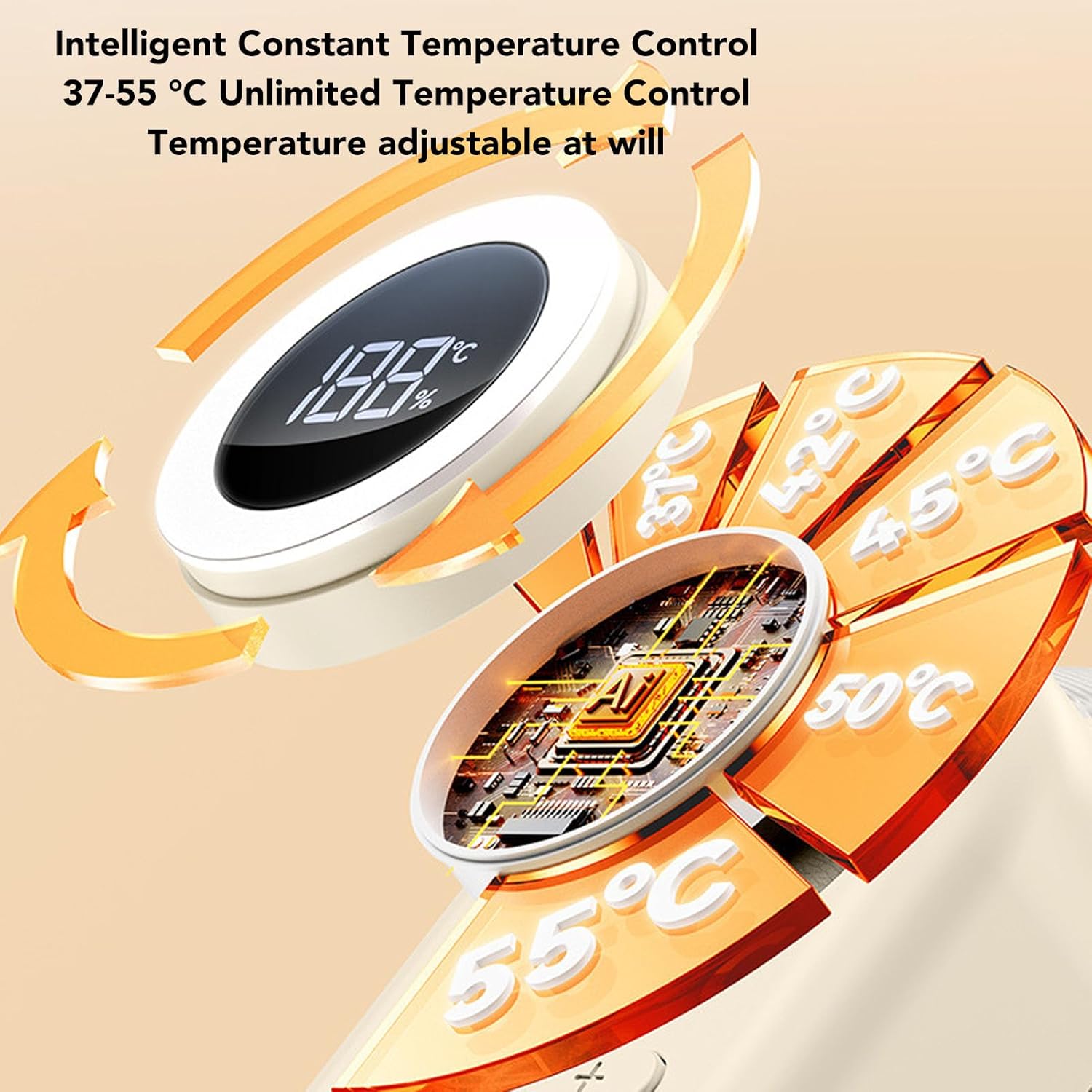 A operação é extremamente intuitiva, bastando um toque curto para definir a temperatura ideal entre 37°C e 55°C. O indicador de temperatura constante acende em verde assim que o nível selecionado é atingido, oferecendo segurança e tranquilidade ao confirmar que o alimento está pronto para o consumo.