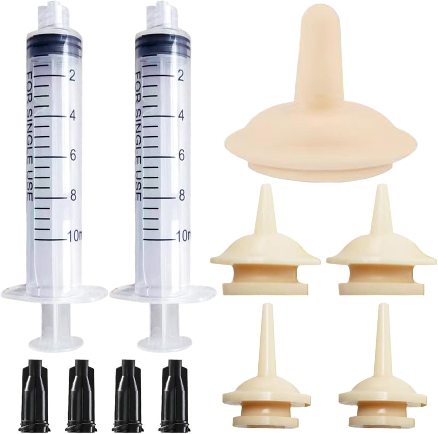 O conjunto possui peso leve de 80 gramas e dimensões compactas de 15 x 5 x 3 cm. O kit é composto por 2 seringas com capacidade de 10 ml cada, 2 chupetas curtas, 2 chupetas longas, 1 chupeta grande e 4 plugues, sendo fabricado com uma combinação resistente de silicone e plástico.