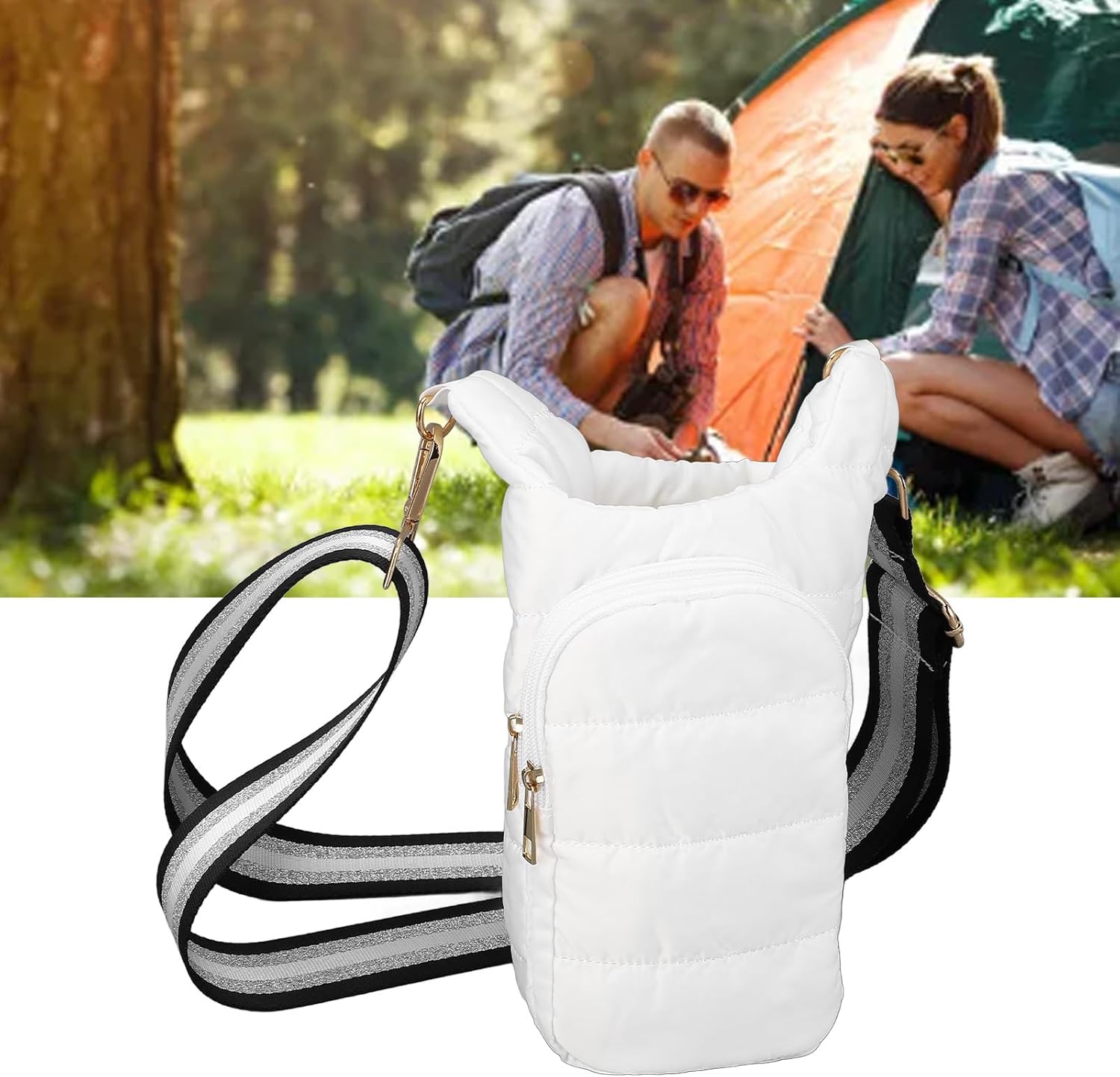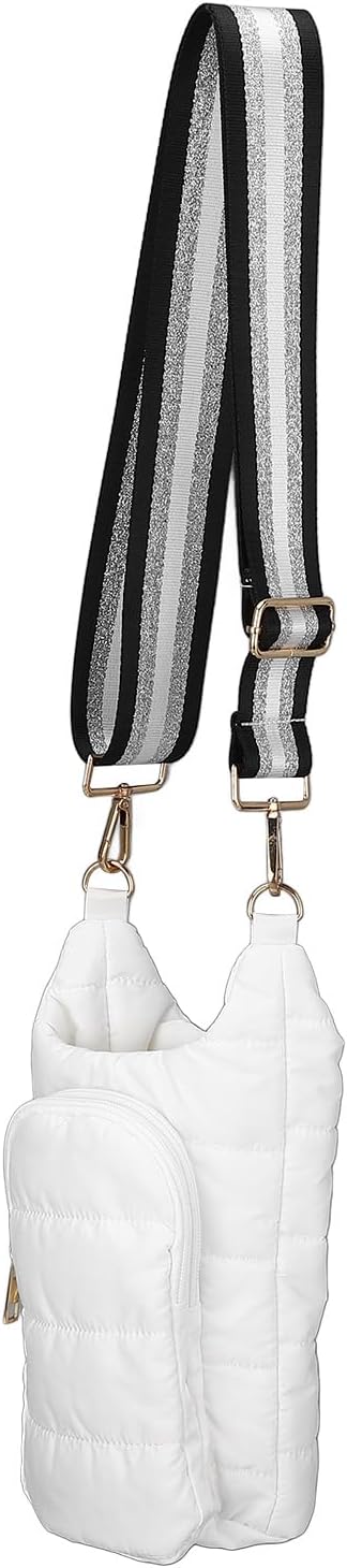 Compatível com a maioria das garrafas de 32 a 40 onças disponíveis no mercado. O pacote inclui uma bolsa de transporte e uma alça de ombro ajustável; a garrafa de água não está inclusa no envio.