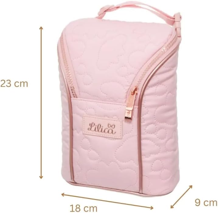 Esta frasqueira térmica possui dimensões compactas de 23 cm de altura, 18 cm de largura e 9 cm de profundidade, sendo perfeitamente dimensionada para comportar até 2 mamadeiras com segurança. O número do modelo 977S12 conta com toda a qualidade de fabricação associada à marca Lilica Ripilica.