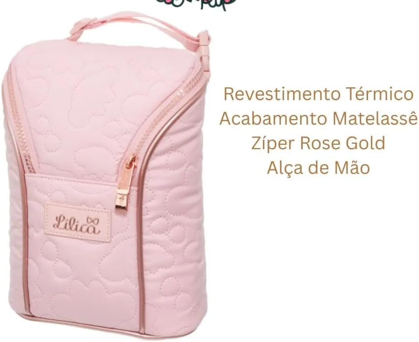 O acabamento em matelassê na cor rosa suave, aliado aos detalhes em rose gold nos zíperes, traz um charme exclusivo à peça. Este acessório foi projetado para oferecer durabilidade, sendo confeccionado em material leve e resistente que facilita o uso diário sem sobrecarregar a rotina dos pais.