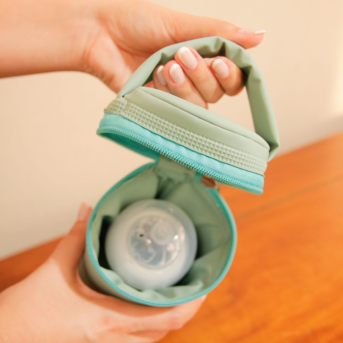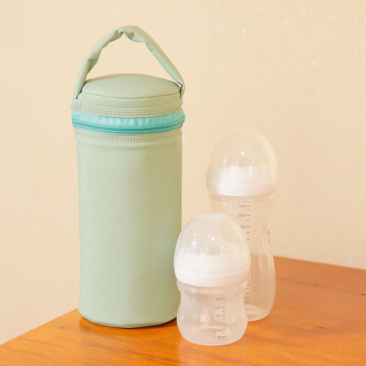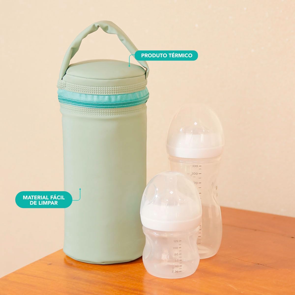 O produto possui medidas aproximadas de 10 x 22 cm, sendo compatível com mamadeiras e copos de até 500ml e comportando um volume interno total de 1 litro. Sua estrutura conta com alça resistente para transporte seguro e fechamento prático com zíper, garantindo que tudo fique no lugar durante o deslocamento.