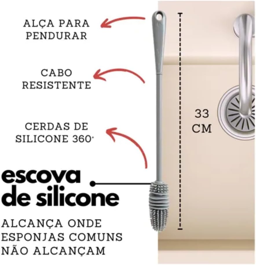 O design da escova foi pensado para a sua comodidade, contando com uma alça ergonômica que proporciona uma pegada segura, mesmo com as mãos molhadas. Além disso, a peça é altamente resistente ao calor e ao frio, não absorvendo odores, o que assegura uma limpeza profunda de mamadeiras e outros recipientes de forma duradoura e muito mais higiênica.