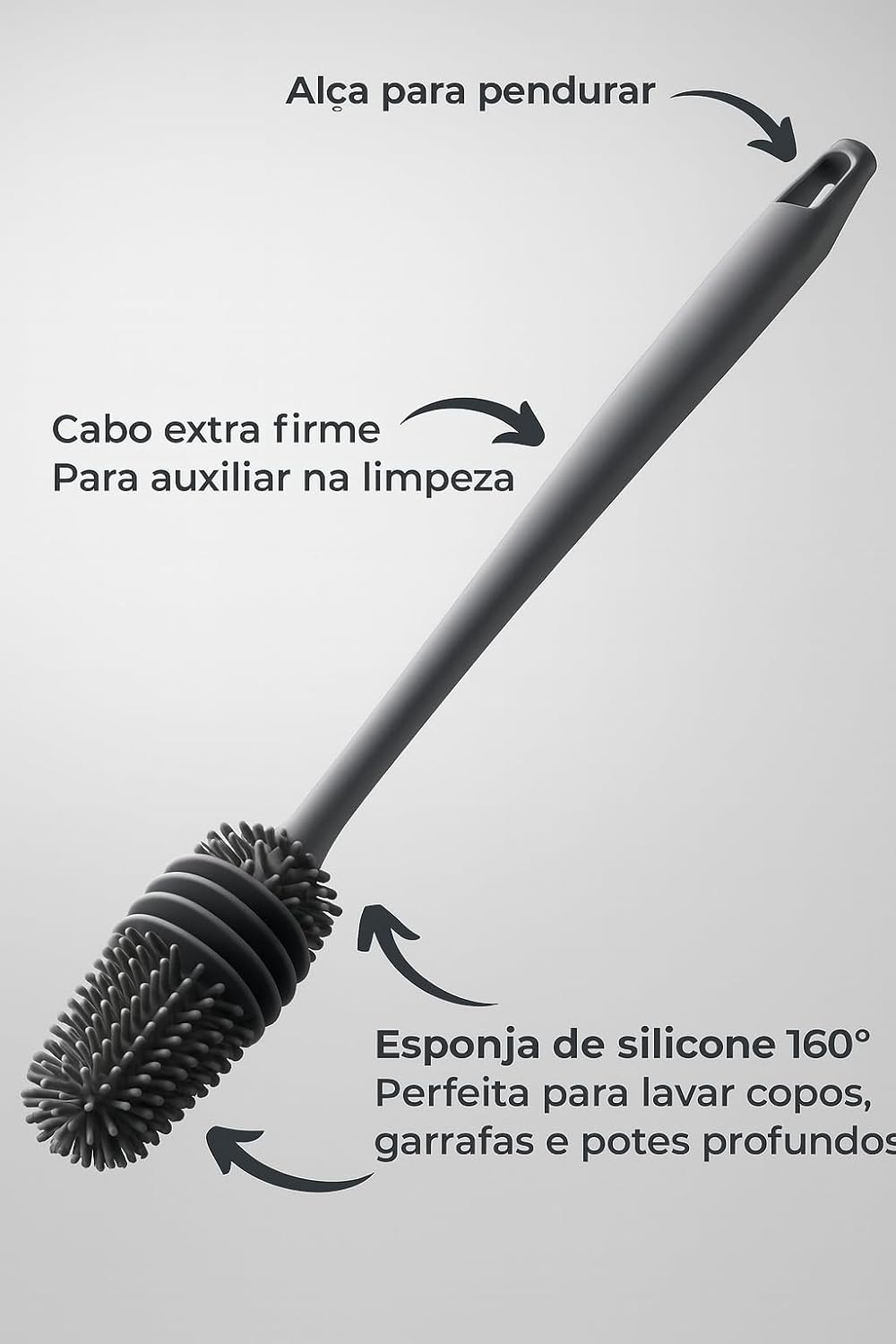 Este conjunto destaca-se pelo design ergonômico, contando com um cabo longo e anatômico que proporciona firmeza e alcance superior em recipientes profundos. O formato facilita a limpeza de locais de difícil acesso, garantindo que nenhum canto passe despercebido durante a higienização.