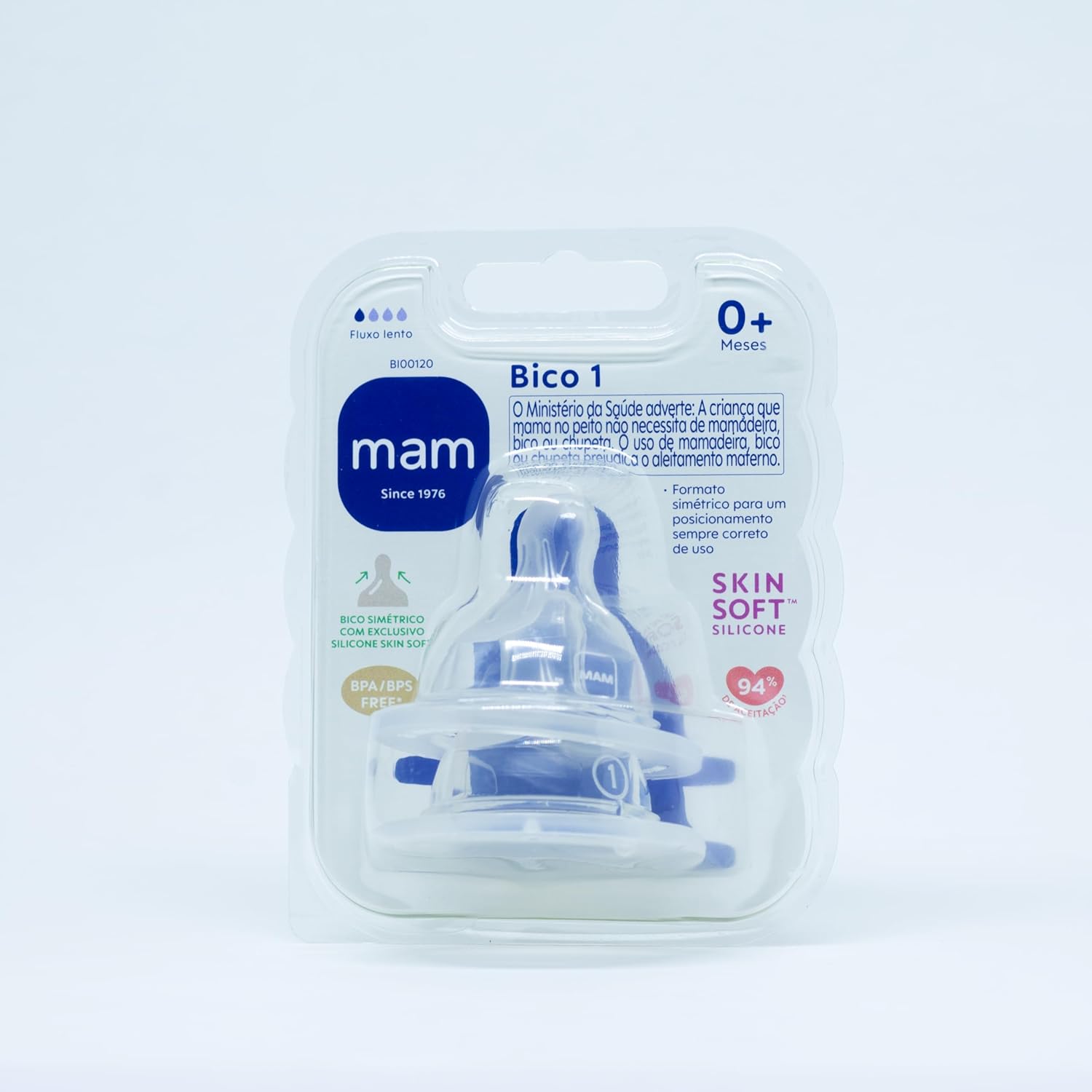 O Ministério da Saúde adverte: a criança que mama no peito não necessita de mamadeira, bico ou chupeta. O uso de mamadeira, bico ou chupeta pode prejudicar o aleitamento materno. Utilize sempre sob supervisão constante.