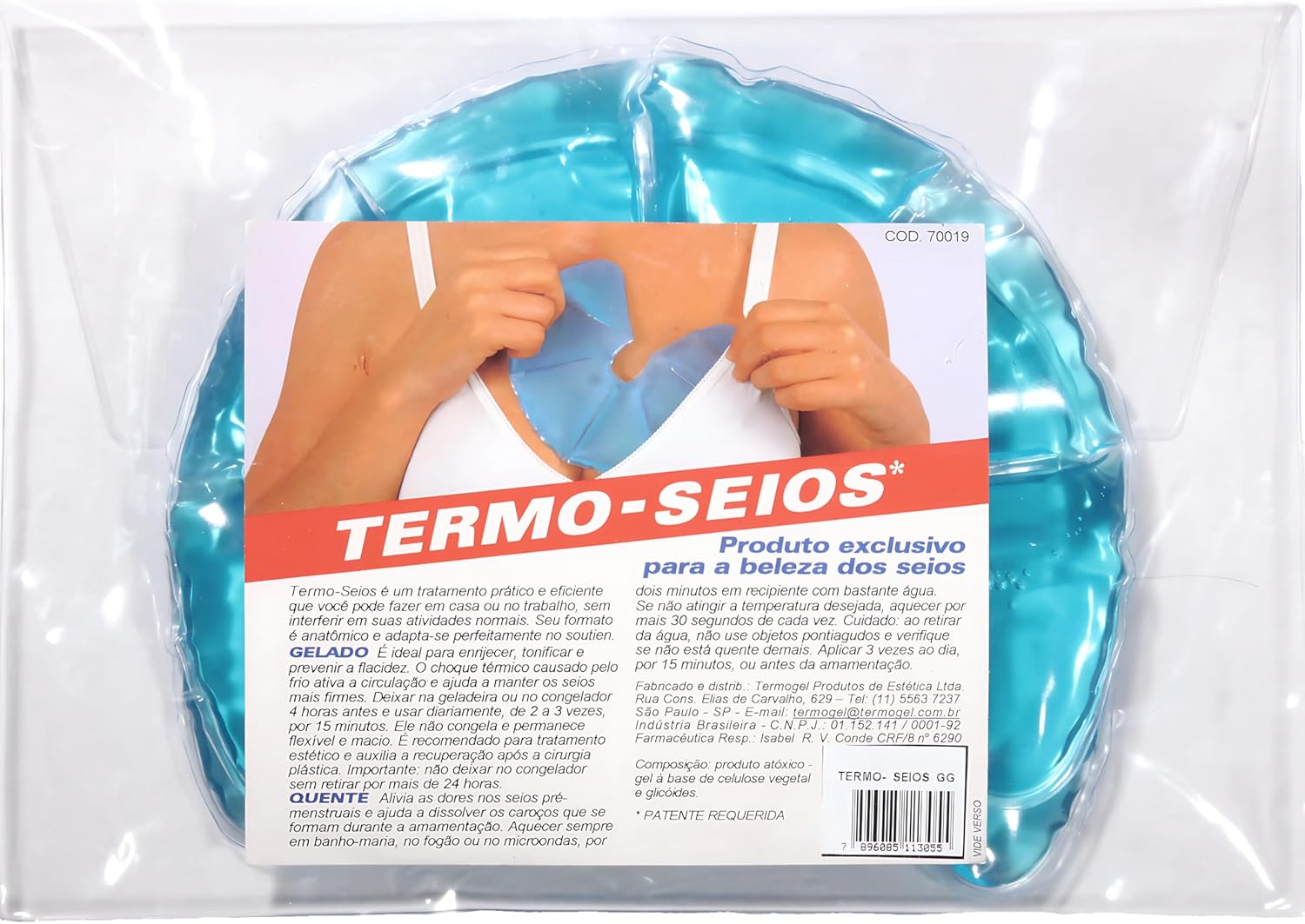 O Termo Seios possui volume de 400ml e formato redondo, pesando aproximadamente 597g. Com dimensões de 30 x 1 x 22 cm, o modelo GG foi desenhado para maior cobertura. O produto não utiliza baterias ou pilhas, garantindo um uso simples e imediato sempre que necessário.