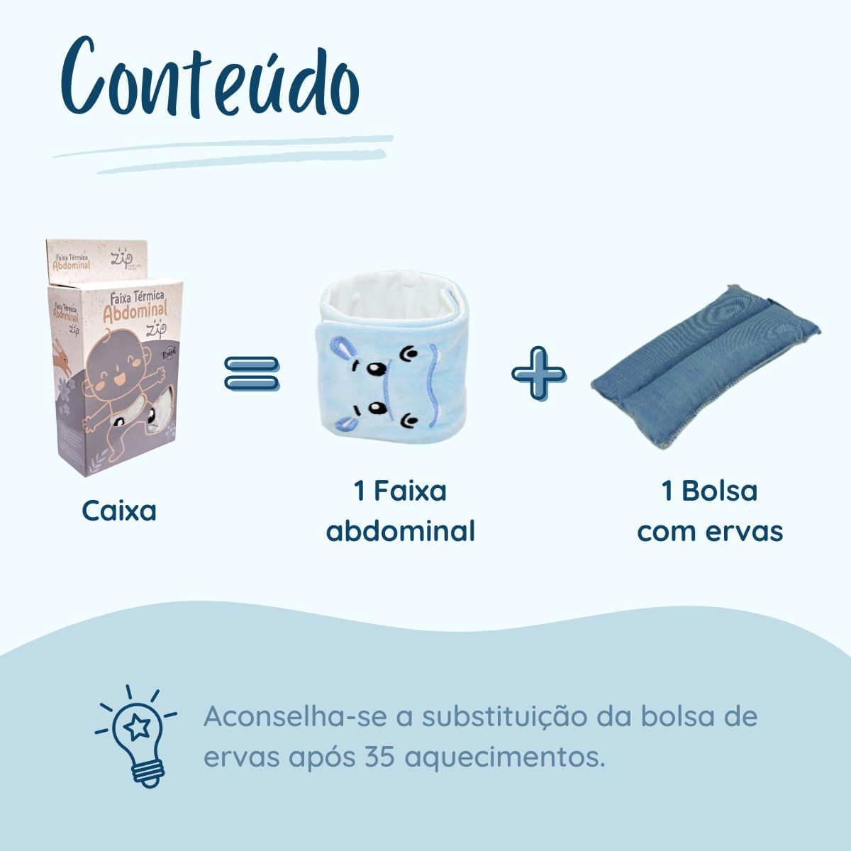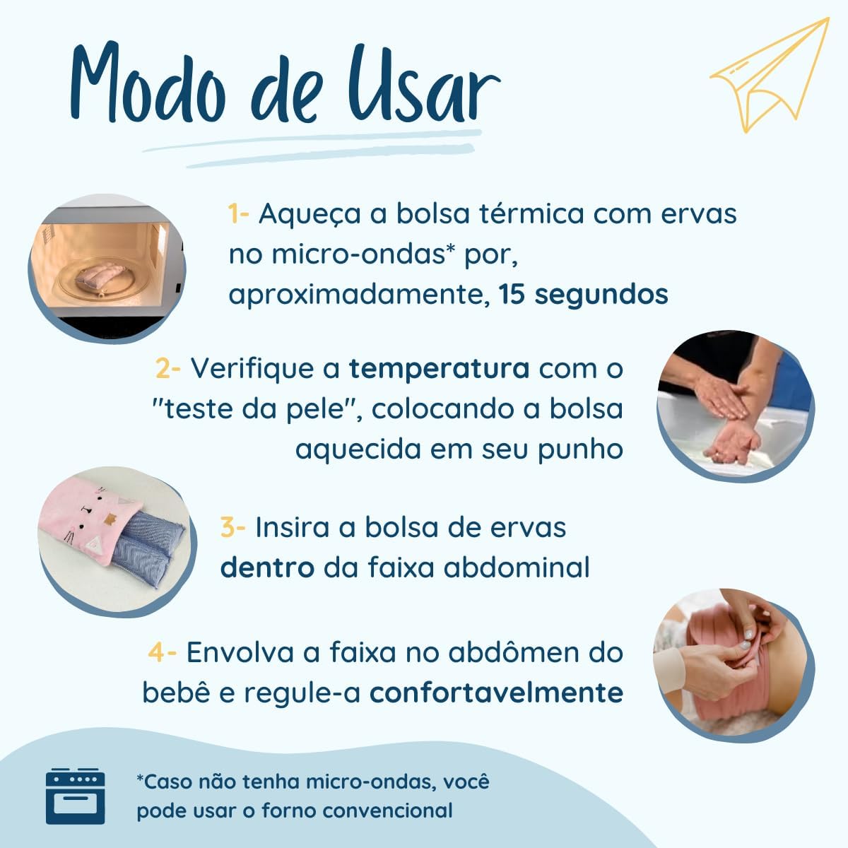 Atenção: a higienização deve ser feita apenas na faixa de tecido, sendo proibido lavar a bolsa de ervas. Verifique sempre a temperatura no seu próprio pulso antes de aplicar no bebê para evitar queimaduras, e lembre-se que bolsas de ervas podem ser adquiridas separadamente.