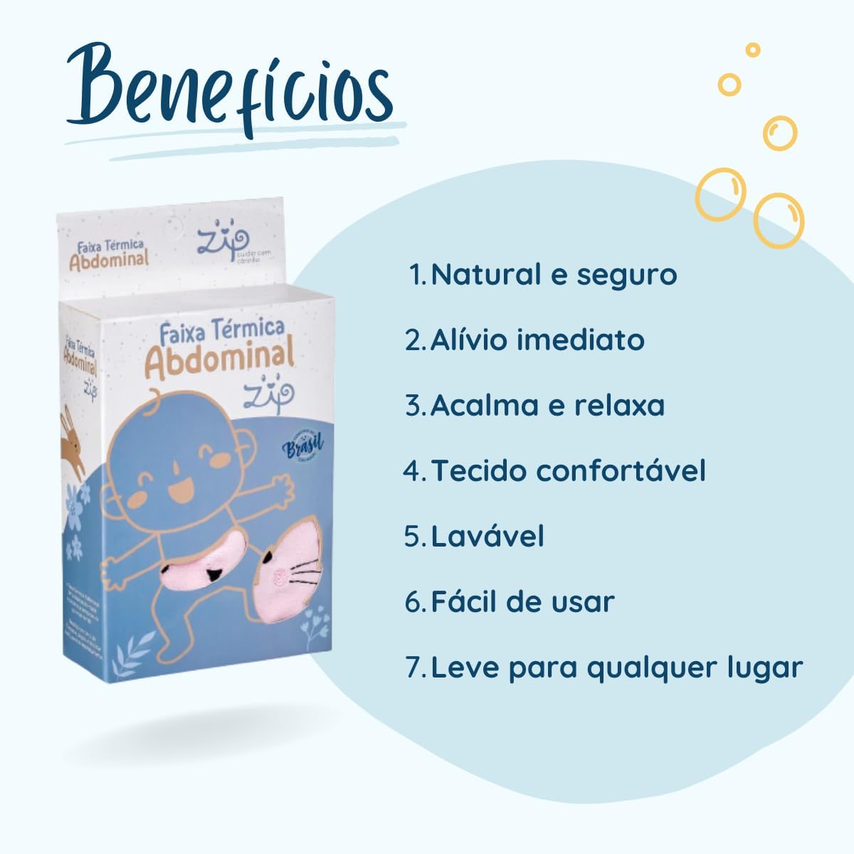 A faixa é totalmente ajustável e confortável, adaptando-se perfeitamente ao corpo do recém-nascido. Essa ergonomia permite que o calor seja distribuído de maneira uniforme, proporcionando uma sensação de acolhimento que auxilia na redução das crises de choro causadas por gases.