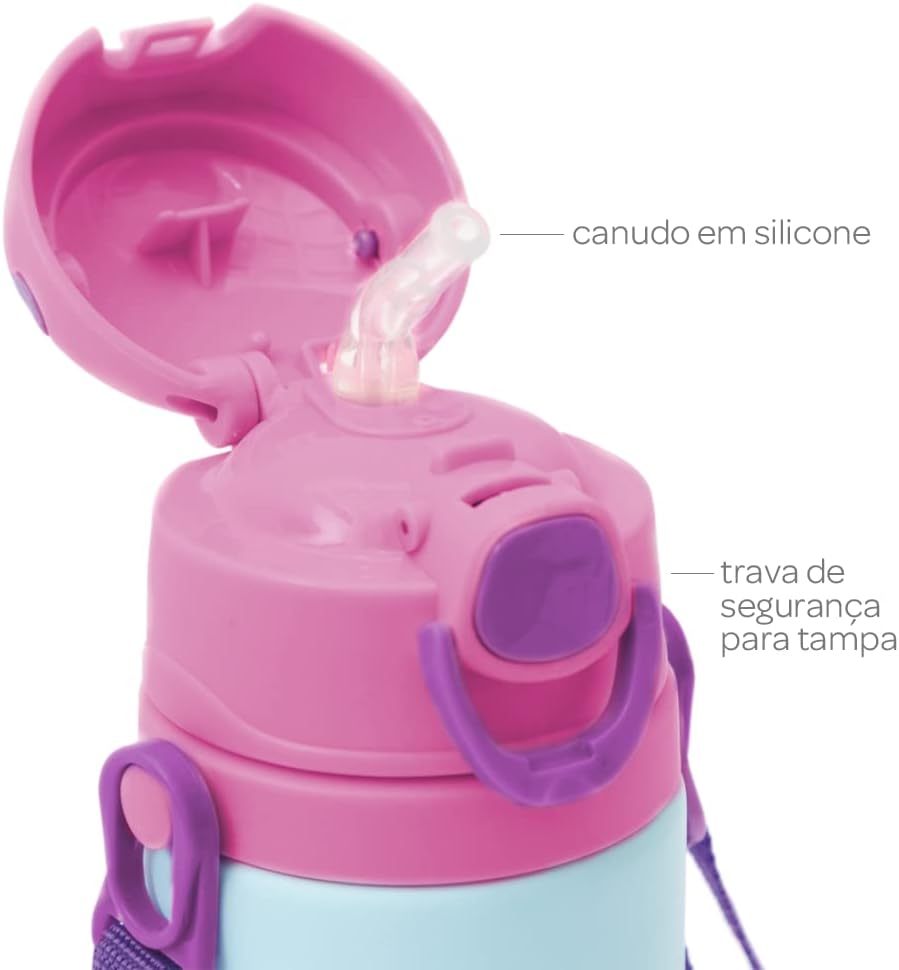 O produto acompanha cordinha tiracolo para transporte. Recomenda-se realizar a higienização regular do canudo de silicone para garantir a conservação ideal e a saúde das crianças durante o uso da sua garrafinha de alumínio com canudo.
