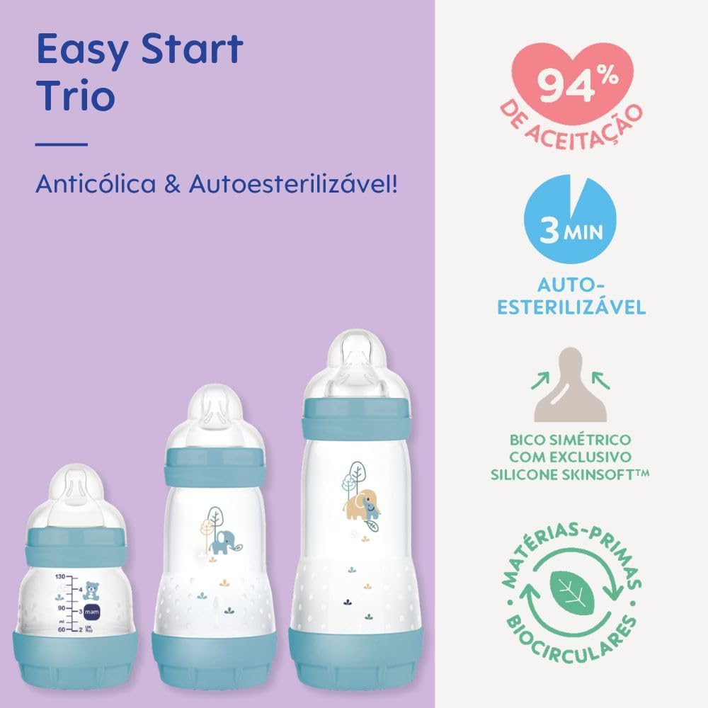 Outro destaque do Easy Start Trio MAM é a praticidade da limpeza. As mamadeiras são totalmente desmontáveis para uma higienização profunda e possuem a função autoesterelizável, que permite esterilizar os frascos em apenas 3 minutos no micro-ondas, economizando tempo no dia a dia. Todos os bicos são produzidos com silicone SkinSoft, que possui textura sedosa e macia, sendo aceito por 94% das crianças.