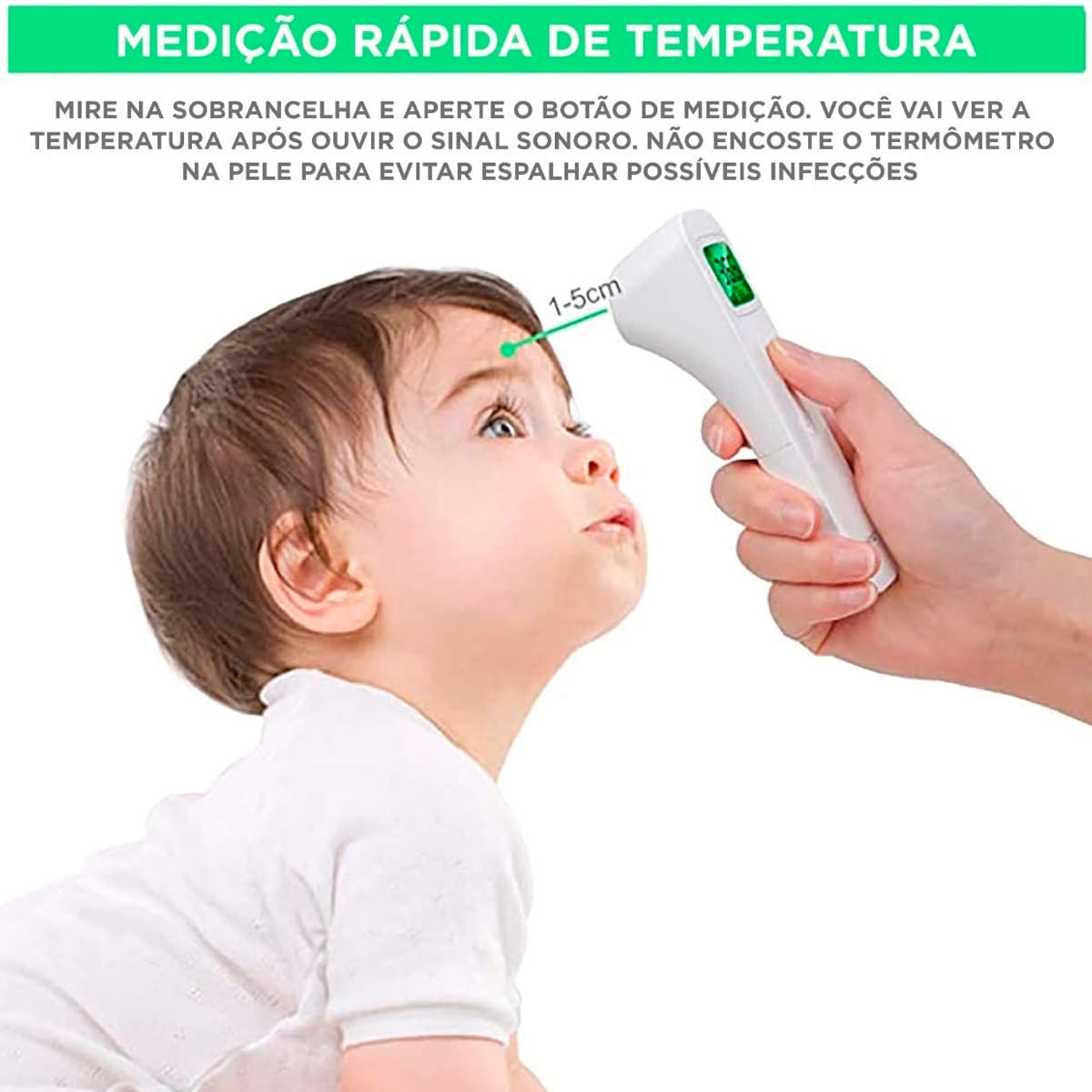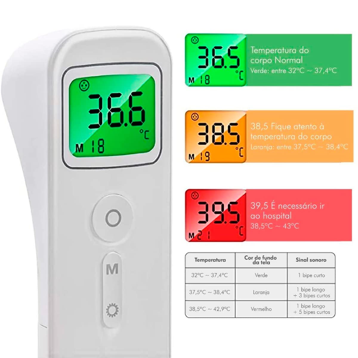 O equipamento possui dimensões compactas de 19 x 16 x 7 cm e peso total de 100 g, garantindo facilidade no manuseio e transporte. Projetado para operar a uma distância de 1 a 5 cm da testa, utiliza escalas de medição em Celsius ou Fahrenheit para atender a diferentes preferências de uso.