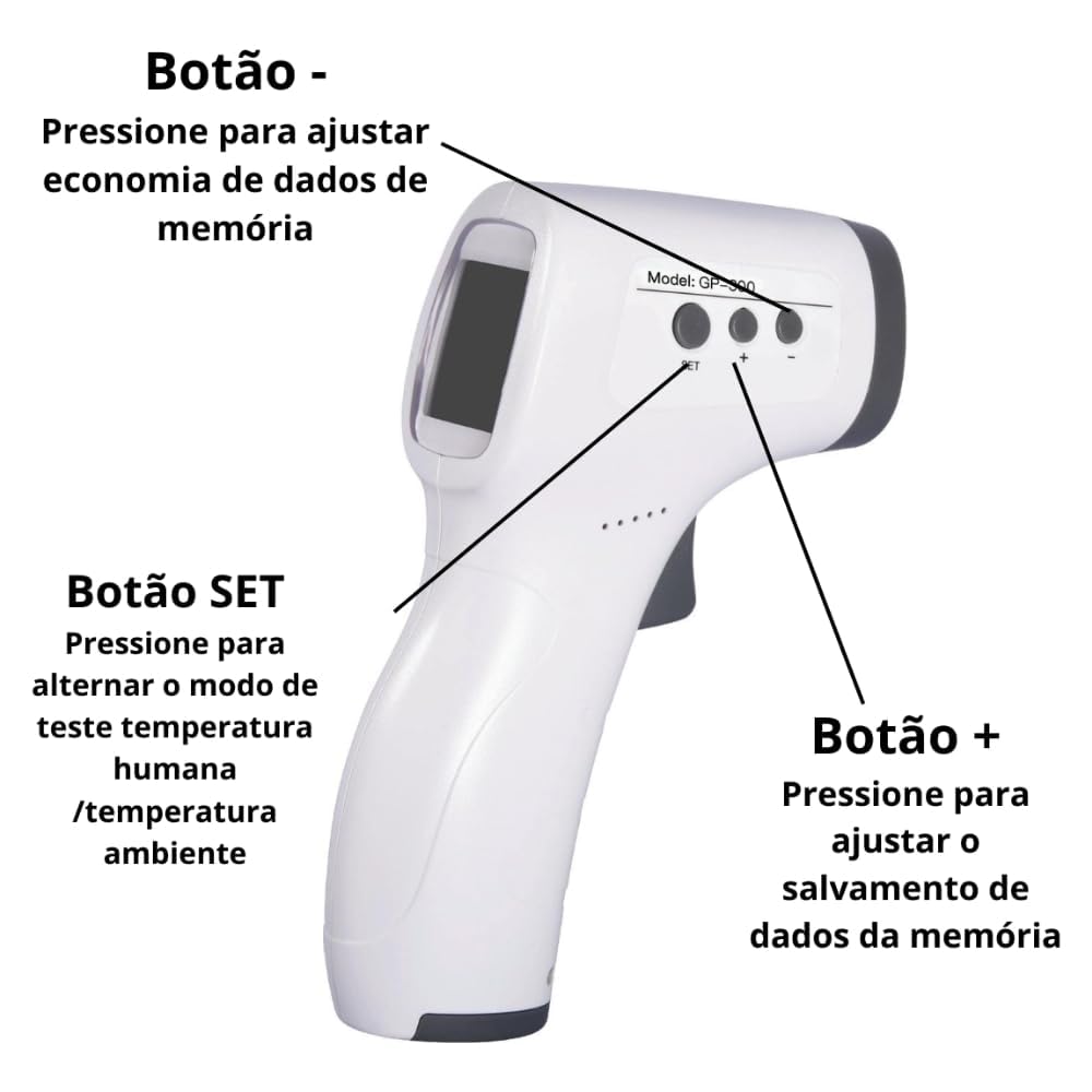 Este modelo opera em uma distância de medição de 3 a 5 cm, com precisão de ±0,2°C para o corpo e ±0,3°C para objetos. Sua faixa de medição corporal varia de 34,8°C a 42,5°C, enquanto para objetos atinge de 0°C a 93°C. O dispositivo conta com memória interna para até 32 registros, facilitando o acompanhamento histórico da temperatura.