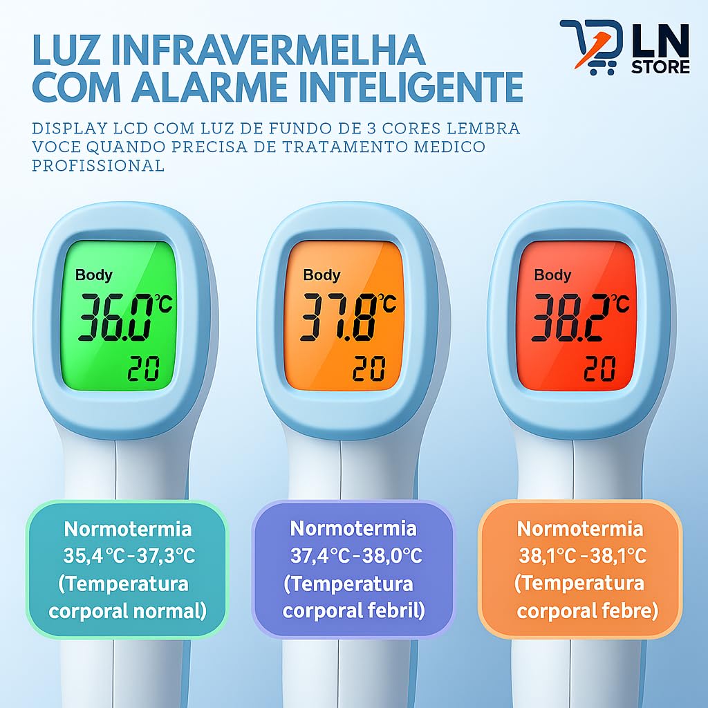 Projetado para facilitar o diagnóstico, o aparelho possui uma tela LCD com alerta de febre por cores, exibindo verde para temperatura normal, amarelo para atenção e vermelho para febre detectada. Além disso, o design ergonômico e portátil, aliado ao modo silencioso, garante manuseio simples e discreto até mesmo durante a noite.