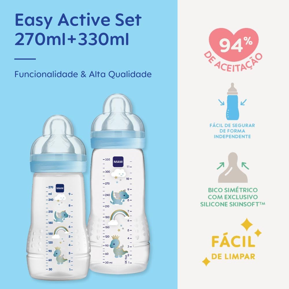 O conjunto traz duas mamadeiras, uma de 270 ml e outra de 330 ml, com bicos de silicone SkinSoft® que apresentam textura macia e sedosa, sendo comprovadamente aceitos por 94% das crianças. A tampa antivazamento protege o bico e pode ser usada para medir pequenos volumes, garantindo praticidade e higiene.