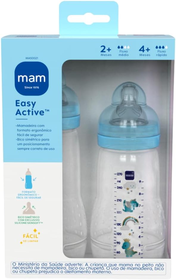 Conheça o Kit de 2 Mamadeiras Easy Active MAM Baby, ideal para bebês a partir de 4 meses. Essas mamadeiras inovadoras são livres de BPA e BPS, contam com tampa antivazamento e bicos de silicone SkinSoft® que proporcionam conforto extra para o seu filho. Com design simétrico e ergonômico, estimulam a independência dos pequenos, facilitando a alimentação diária.