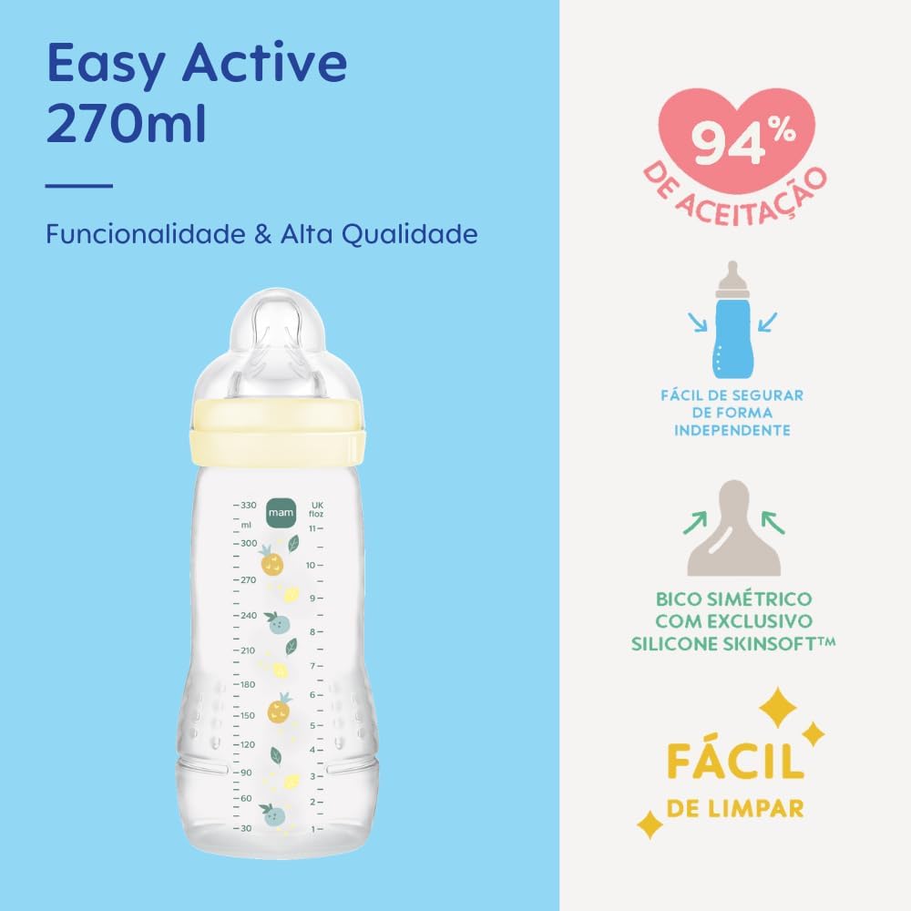 A mamadeira Easy Active da MAM é ideal para bebês a partir de 4 meses e combina segurança, praticidade e conforto. Desenvolvida com tecnologia SkinSoft, seu bico de silicone macio e texturizado é aceito por 94% das crianças, garantindo uma alimentação tranquila e natural. Sem BPA e com tampa antivazamento, essa mamadeira oferece higiene e proteção para o seu filho(a).