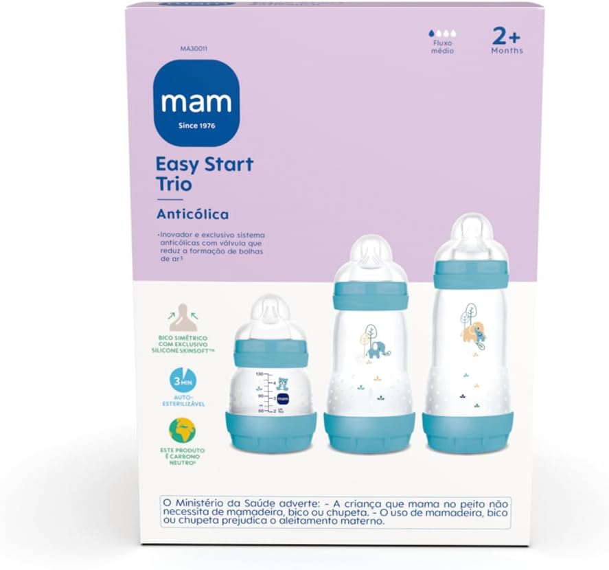 O kit Easy Start Trio MAM inclui três tamanhos de mamadeiras (130 ml, 260 ml e 320 ml) com a exclusiva base ventilada que permite um fluxo contínuo e suave, impedindo que o bebê engula ar e reduzindo o desconforto das cólicas. Além disso, as mamadeiras são totalmente desmontáveis, oferecendo fácil higiene e esterilização, podendo ser autoesterilizadas em apenas 3 minutos, um benefício exclusivo da MAM.