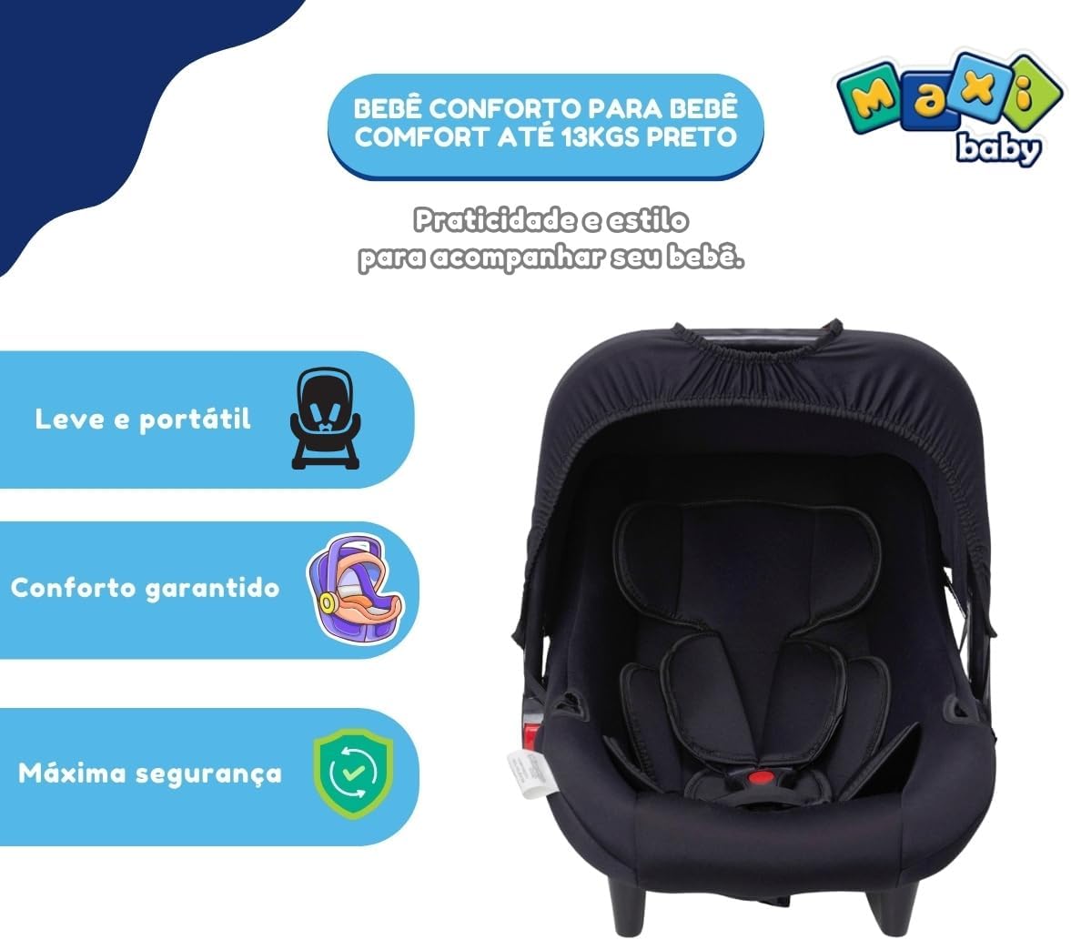 Leve e fácil de instalar, a cadeirinha Maxi Baby une praticidade e segurança para pais e filhos. Seu design robusto em metal, plástico e poliéster proporciona resistência e durabilidade, enquanto o sistema de **3 pontos de arreio** oferece fixação segura e confortável para o bebê. Com duas posições para melhor ajuste, ela acompanha o crescimento da criança, oferecendo conforto e suporte.