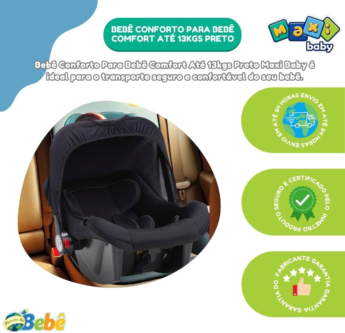 As dimensões da cadeirinha Maxi Baby são 66 x 27 x 43 cm, com peso leve de apenas 3,1 quilogramas, facilitando o transporte e a instalação no veículo. Sua composição utiliza plástico, espuma de poliuretano e tecido resistente, combinando conforto e segurança. O produto é certificado pelo INMETRO nº 009750/2022, garantindo conformidade com normas de segurança nacionais.