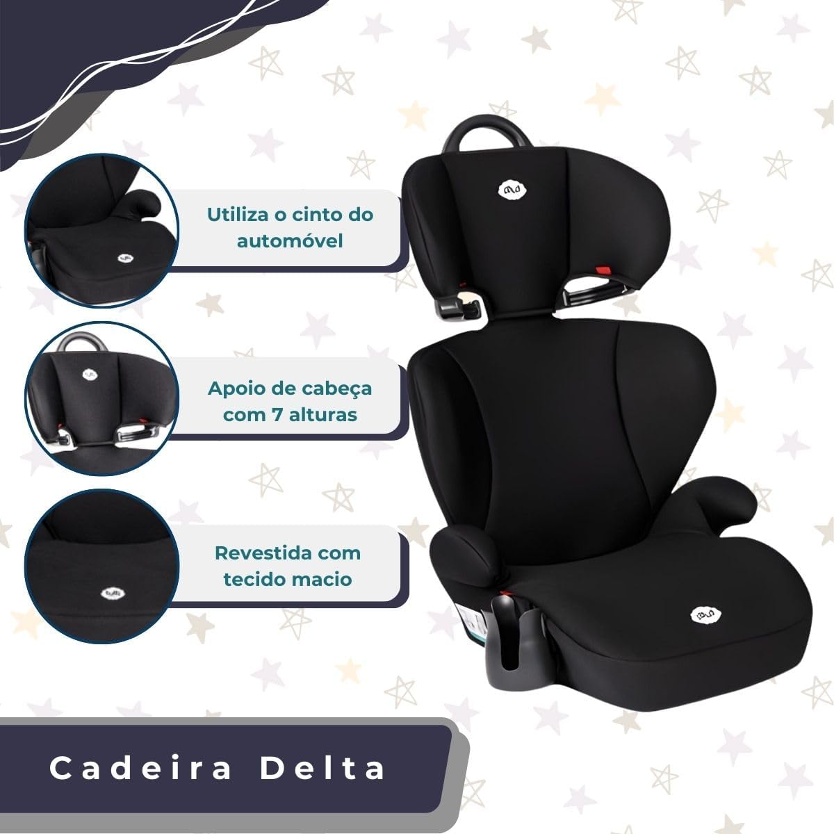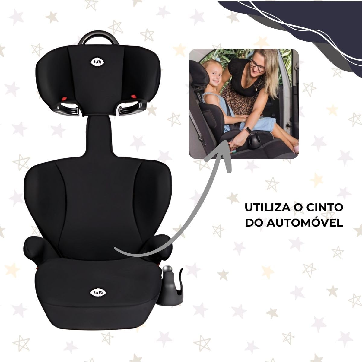 Fabricada em plástico resistente e revestida com 100% poliéster, a cadeira mede 39 x 46 x 74 cm e pesa apenas 2,5 kg, facilitando o transporte e o manuseio. Recomendado para crianças a partir de 24 meses, suporta até 36 kg, abrangendo os Grupos II e III segundo a certificação 004123/2020. A orientação é para o uso virado para a frente, garantindo compatibilidade com a maioria dos veículos.