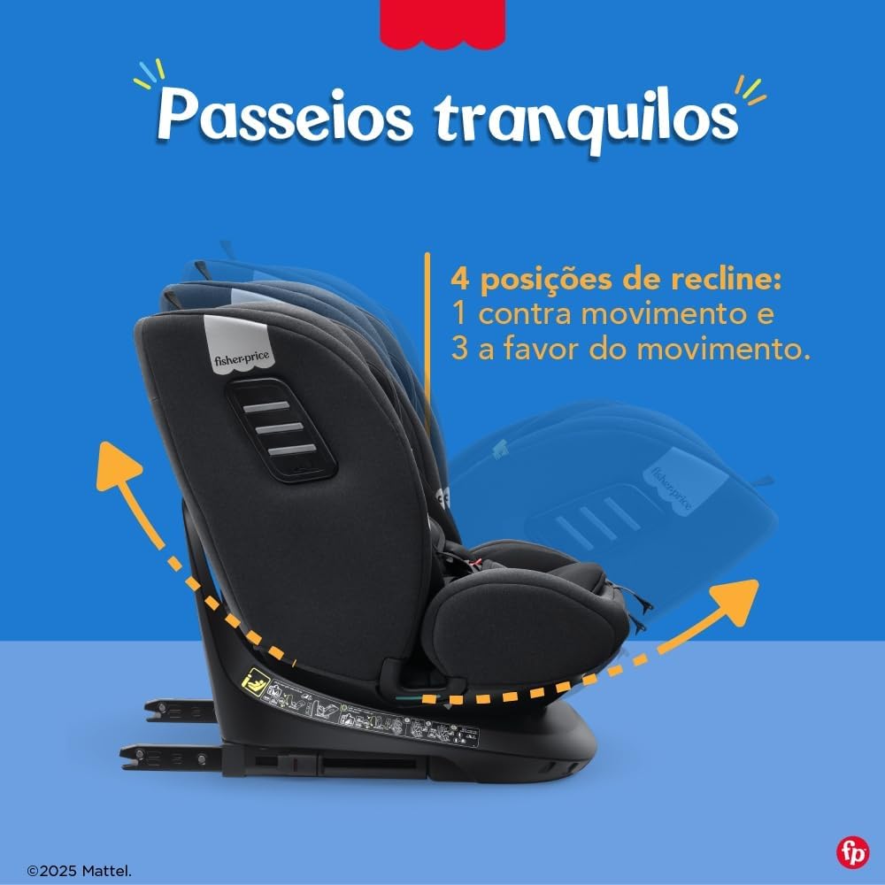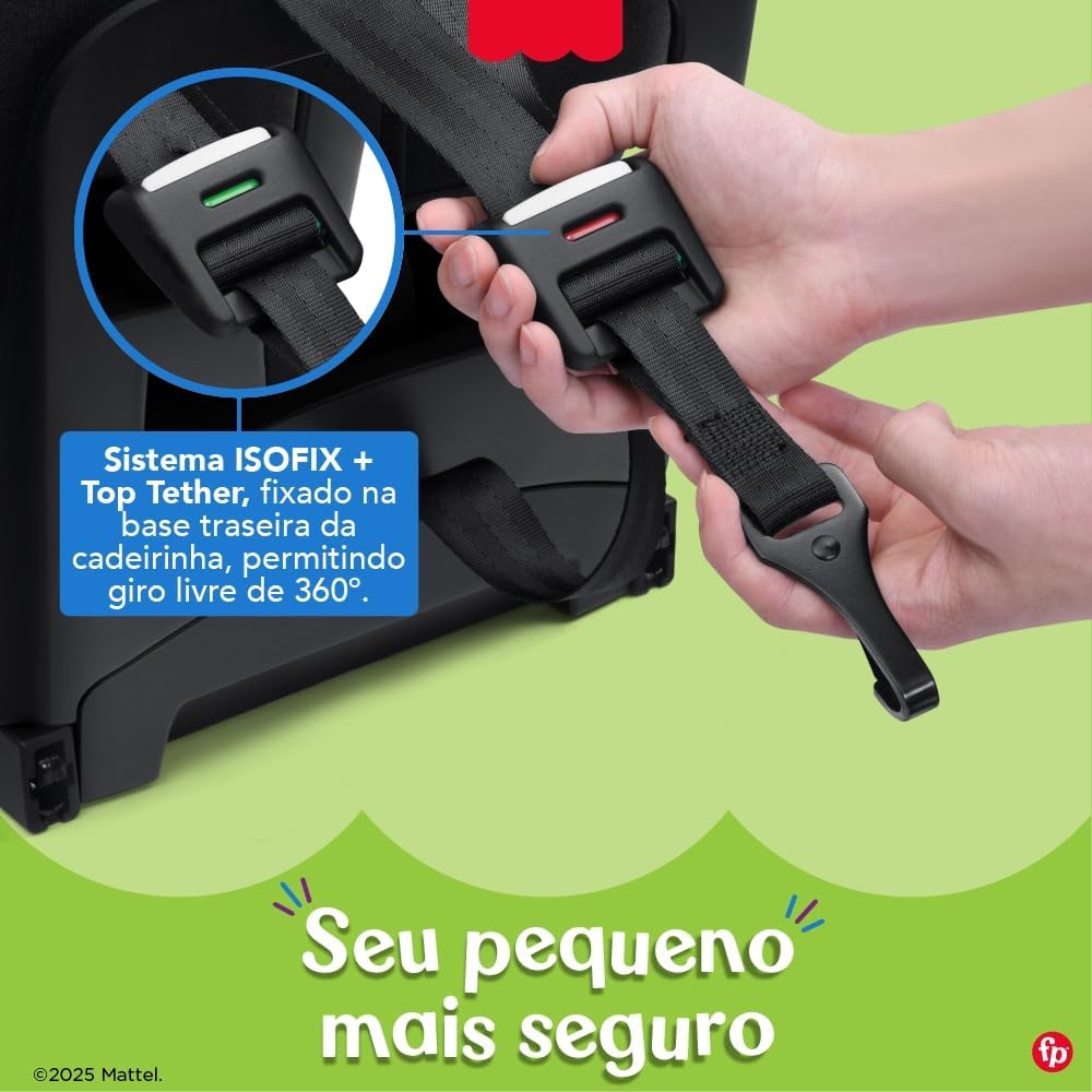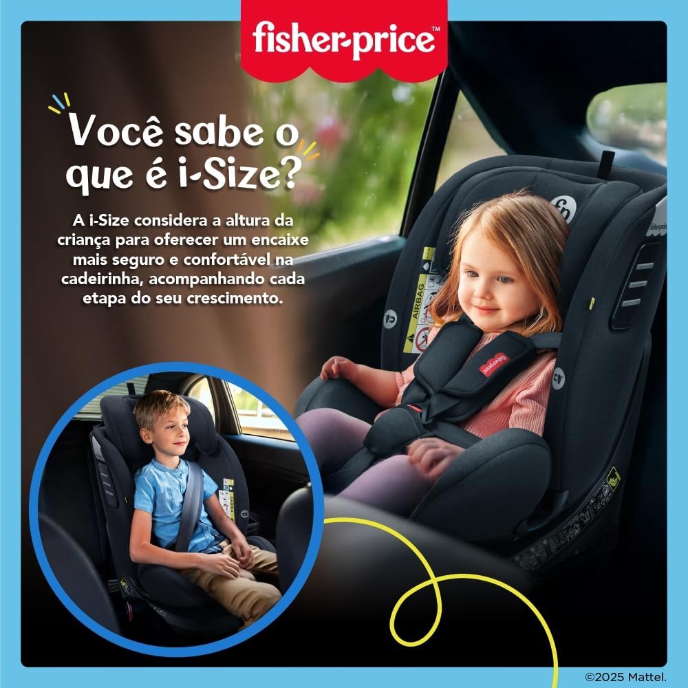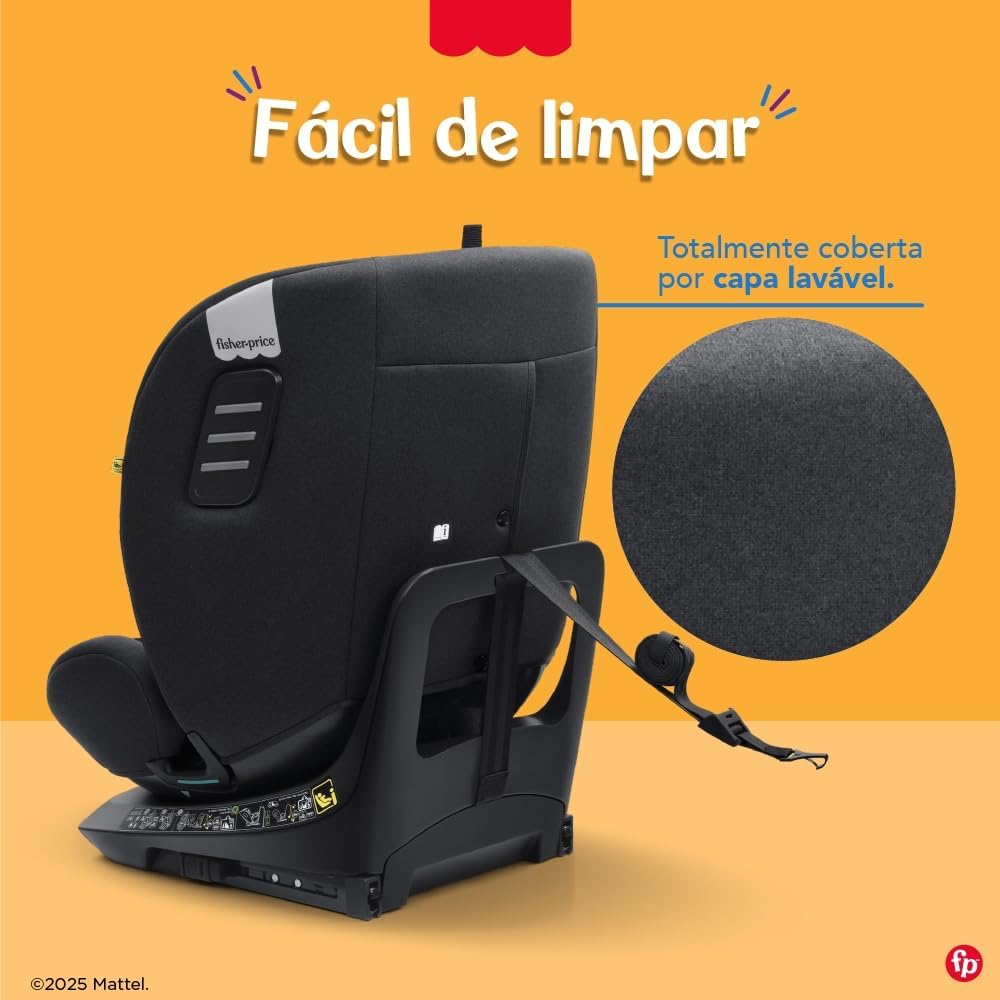 A Cadeira tem dimensões de 53 x 44,5 x 60 cm e pesa 12,3 kg, fabricada com materiais de alta qualidade como metal, PU, plástico, polipropileno e poliéster, além de um confortável revestimento de tecido. Compatível com crianças de 40 cm a 150 cm, a cadeira segue o padrão i-Size, possibilitando instalação segura de acordo com a certificação Inmetro 000570/2025.