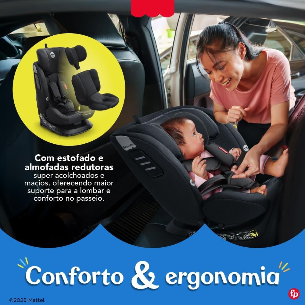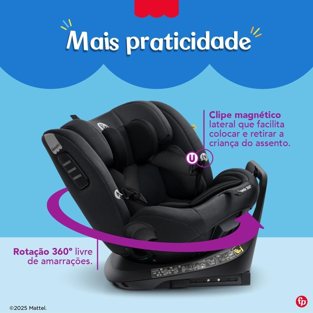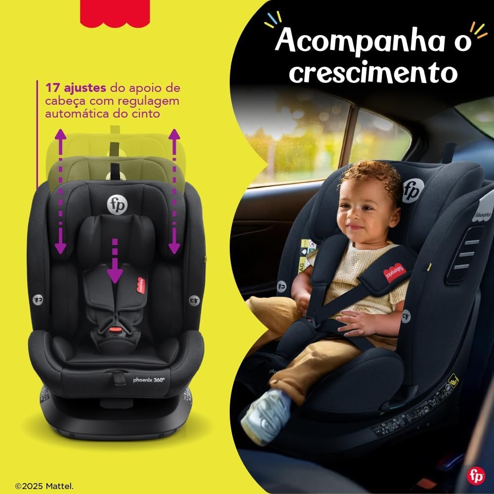 Com rotação de 360° sem amarrações, a Cadeira Phoenix 360º facilita colocar e retirar a criança, tornando o dia a dia mais prático para os pais. O estofado super acolchoado e a almofada redutora garantem conforto máximo, complementados por uma capa totalmente lavável e quatro posições de recline, adaptando-se perfeitamente às necessidades da criança.