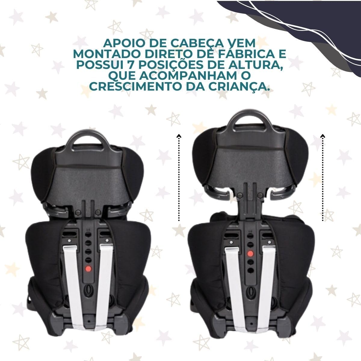 Essa cadeira possui um apoio de cabeça ajustável em 5 posições, adaptando-se ao desenvolvimento da criança para maior conforto e segurança. O design moderno combina estilo e funcionalidade, integrando perfeitamente ao interior do veículo. Além disso, o revestimento acolchoado removível e lavável facilita a manutenção, proporcionando durabilidade e praticidade para os pais.
