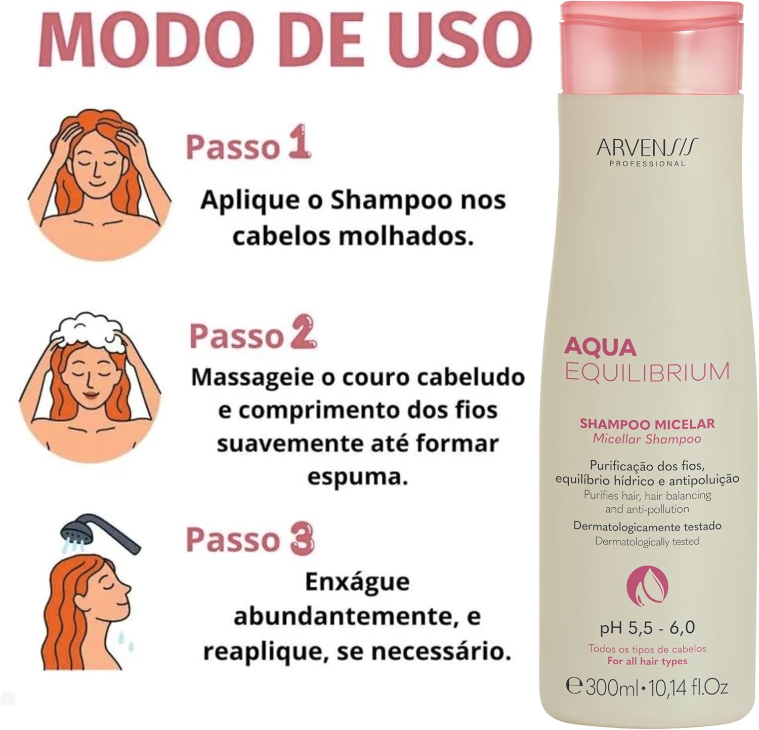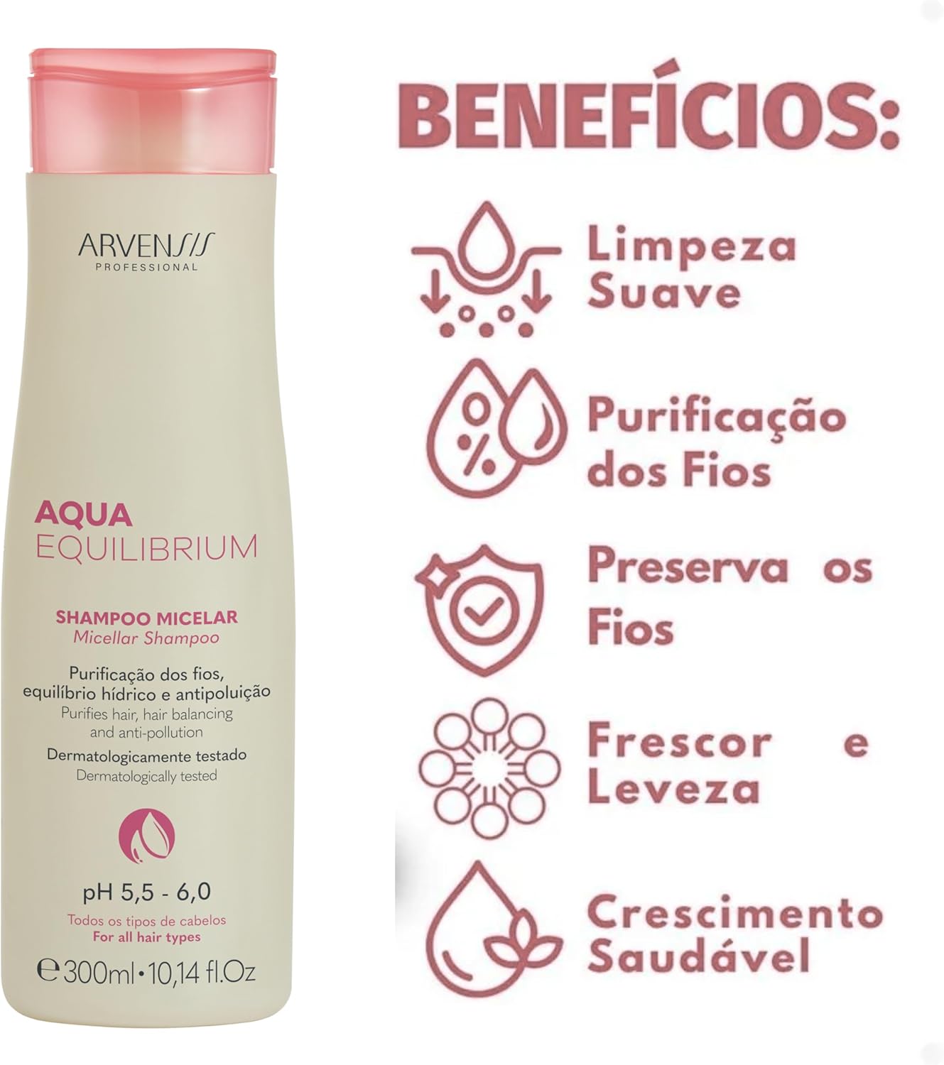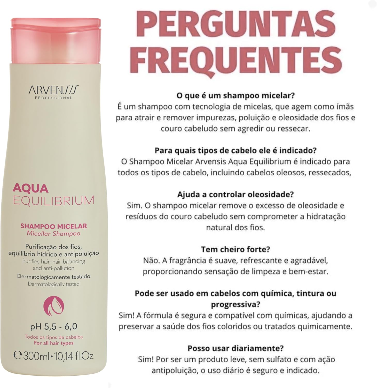 O Shampoo Micelar Aqua Equilibrium vem em embalagem de 300ml, com dimensões do produto de 5,5 x 5,5 x 31 cm e peso de 325 gramas. Fabricado pela Arvensis, ele é adequado para uso em todos os tipos de cabelo e não utiliza bateria ou pilha.