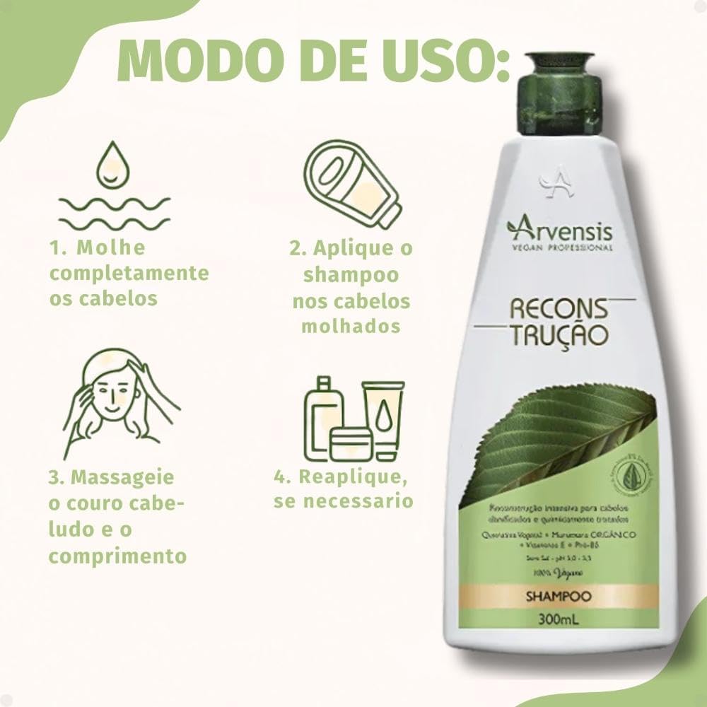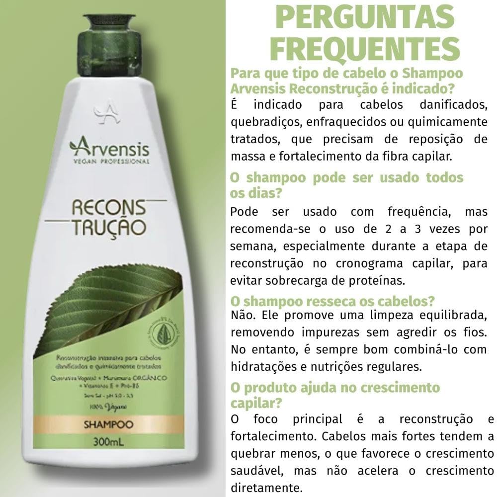 O produto possui 300ml com dimensões de 5,5 x 5,5 x 18,3 cm e peso de 325 g, facilitando seu manuseio e armazenamento. Indicado para todos os tipos de cabelo, especialmente os danificados ou frágeis, o shampoo é fabricado pela Arvensis e não utiliza baterias ou pilhas, sendo um produto 100% focado no cuidado capilar.