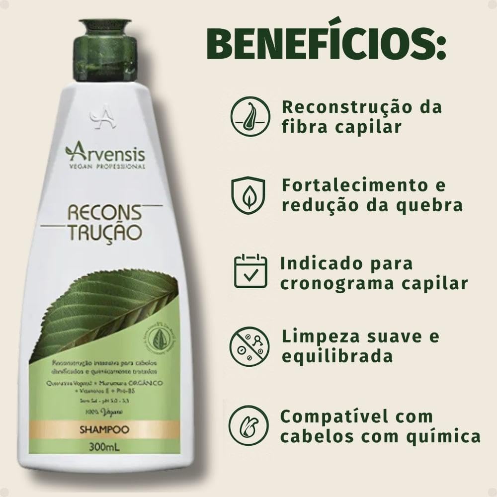 O Shampoo Reconstrução Arvensis 300ml foi desenvolvido para limpar suavemente e fortalecer cabelos danificados e quimicamente tratados. Com fórmula vegana e livre de parabenos, ele desembaraça os fios, devolve brilho e resistência, preparando-os para receber o condicionador. Seu uso diário garante cabelos mais fortes, revitalizados e protegidos.