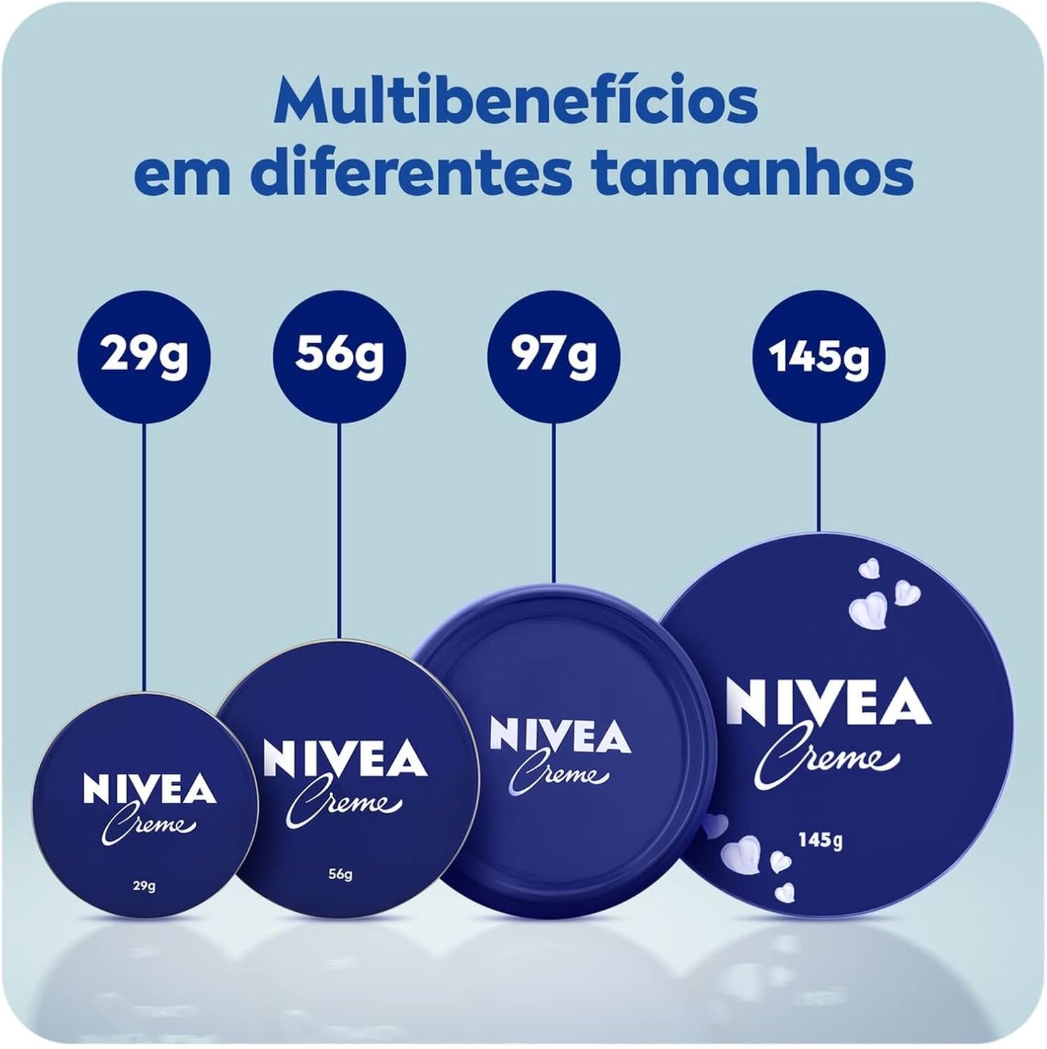 O produto apresenta um formato prático de latinha com 29g de conteúdo, ideal para levar na bolsa ou necessaire. Com dimensões de 6 x 6 x 1,3 cm e pesando apenas 36g, este creme hidratante da NIVEA é compacto, leve e extremamente fácil de transportar para onde você for.