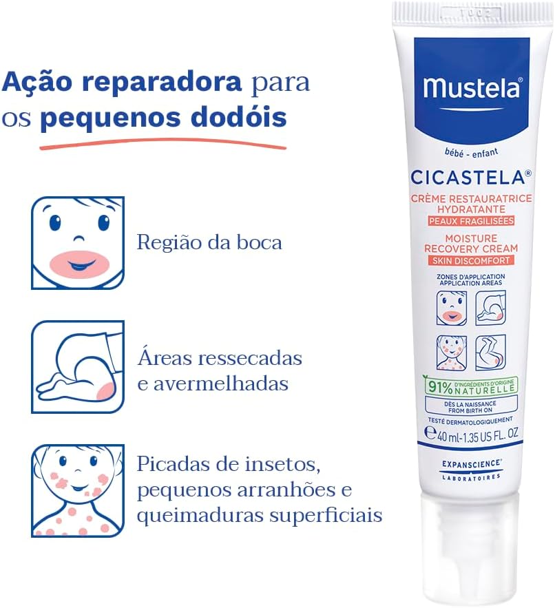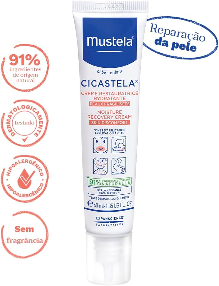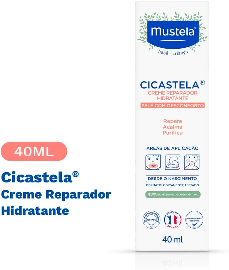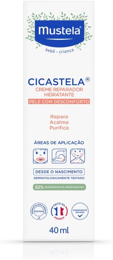 O Mustela Cicastela possui um volume de 40 ml, ideal para transporte prático. O produto apresenta dimensões de 4,45 x 3,81 x 15,24 cm com um peso total de aproximadamente 54,43 g. Sua composição é segura para todos os tipos de pele e não possui fragrância, garantindo alta tolerabilidade cutânea.