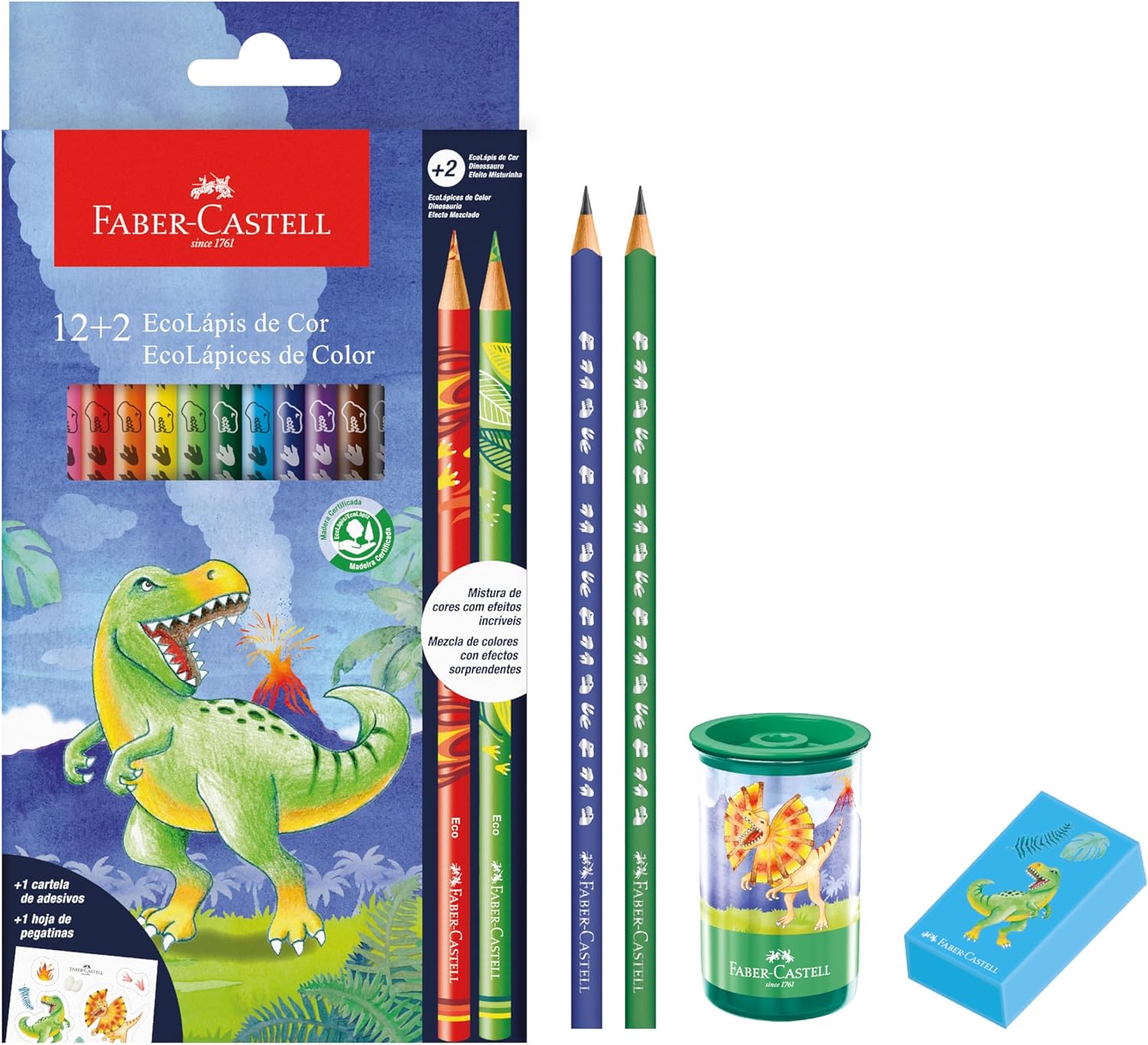 O conjunto oferece um total de 18 itens indispensáveis, acompanhados pelos exclusivos EcoLápis. Esses lápis de cor são produzidos em madeira de reflorestamento, garantindo um produto sustentável e resistente que facilita o apontar e evita a quebra constante durante o uso.