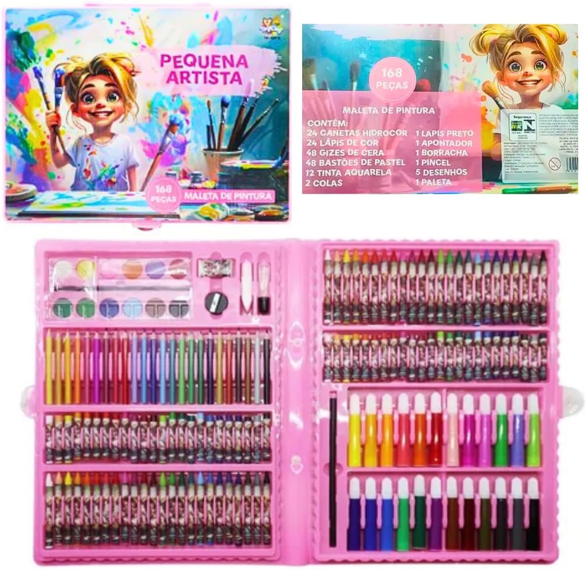 O produto possui o modelo identificador 001, apresentando um acabamento na cor rosa que atrai visualmente o público jovem. O conjunto é composto por 1 unidade do kit, com tinta multicolorida de alta qualidade distribuída em uma embalagem com dimensões de 38,5 x 29,5 x 3,9 cm e peso total de 970 gramas.
