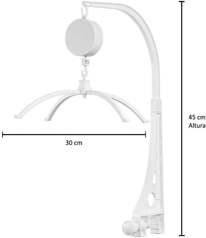 Este móbile possui dimensões de 40cm x 30cm x 45cm e um peso total de apenas 350 gramas, facilitando a montagem e o manuseio. O material é plástico seguro e resistente, com fixação por rosca ajustável que permite a instalação rápida em berços, chiqueirinhos ou outras plataformas compatíveis.