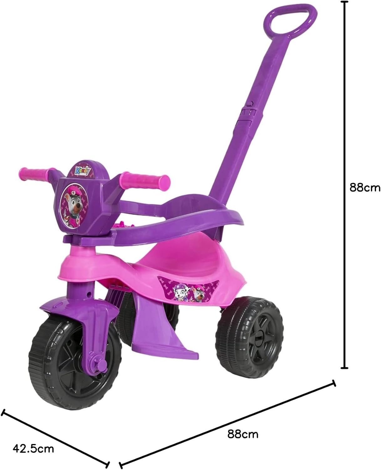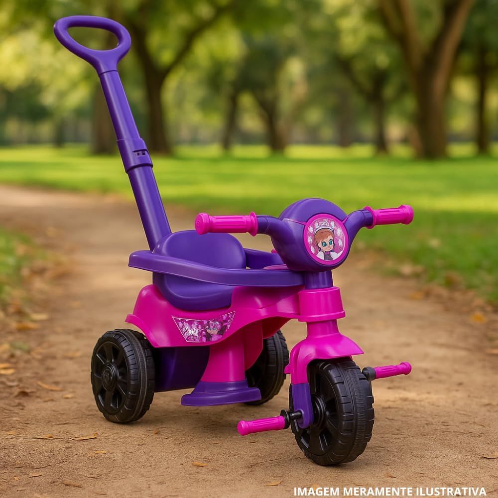 Fabricado em polipropileno de alta resistência, o produto oferece durabilidade e leveza, facilitando o transporte e a condução. Por ser um triciclo infantil com haste prático, ele dispensa o uso de baterias ou pilhas, permitindo que a aventura comece instantaneamente sem preocupações com recargas.