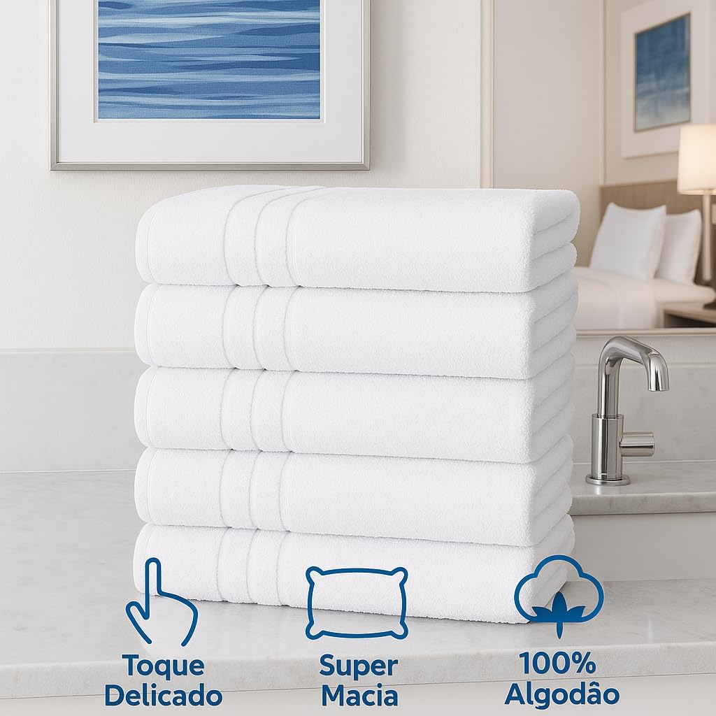 O conjunto oferece o melhor custo-benefício ao unir cinco peças de alta qualidade em um único pacote. A cor branca é versátil e atemporal, permitindo que estas toalhas de banho se adaptem facilmente a qualquer estilo de decoração, mantendo o visual do seu banheiro sempre impecável.