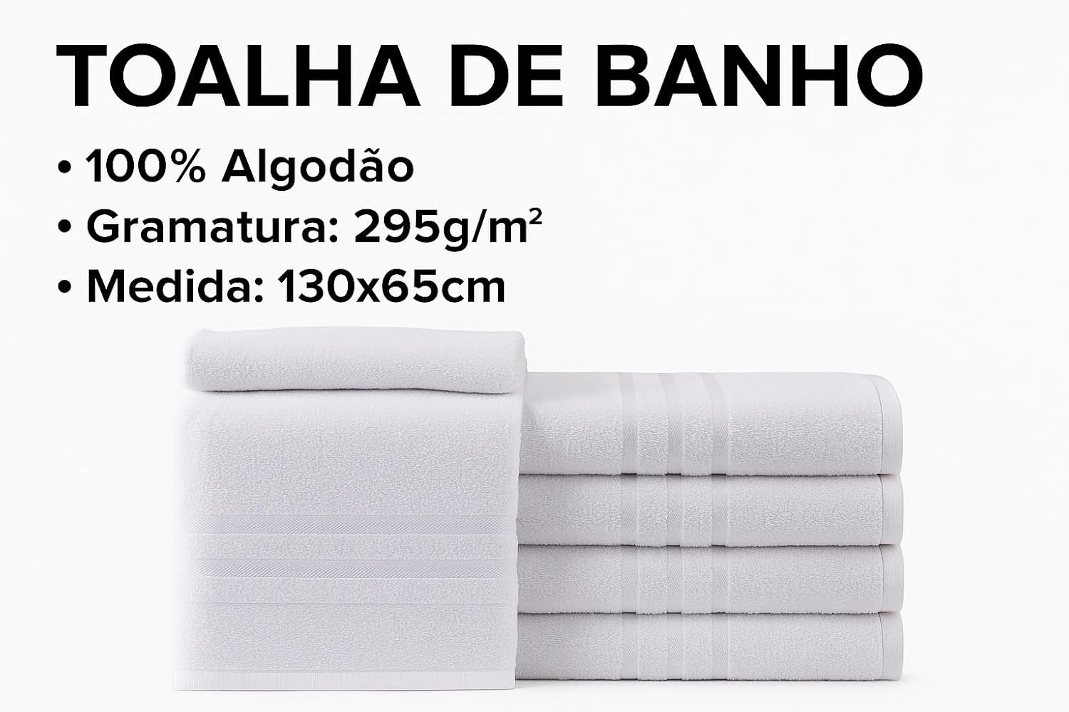 Cada toalha do modelo HOTEL possui dimensões de 130 x 65 x 0,5 cm, garantindo um tamanho generoso para diferentes necessidades. O peso total do kit com cinco unidades é de 1,15 quilogramas, refletindo a densidade e o padrão das toalhas de banho brancas básicas que compõem o kit TBC001.