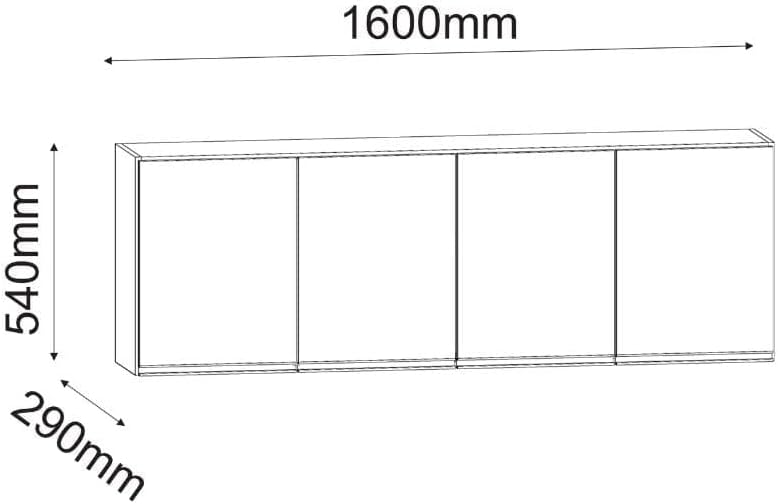 O armário possui dimensões totais de 54cm de altura, 160cm de largura e 29cm de profundidade. Com um peso estrutural de 29kg, o modelo suporta até 35kg distribuídos, oferecendo a robustez necessária para armazenar mantimentos e itens de louça com segurança total.