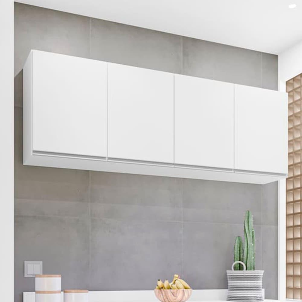 O design inteligente conta com 4 portas e 1 prateleira interna, otimizando a disposição dos objetos. Sendo um excelente armário de cozinha suspenso, ele libera espaço útil na bancada e proporciona uma organização vertical que transforma qualquer cozinha em um local mais funcional e agradável.
