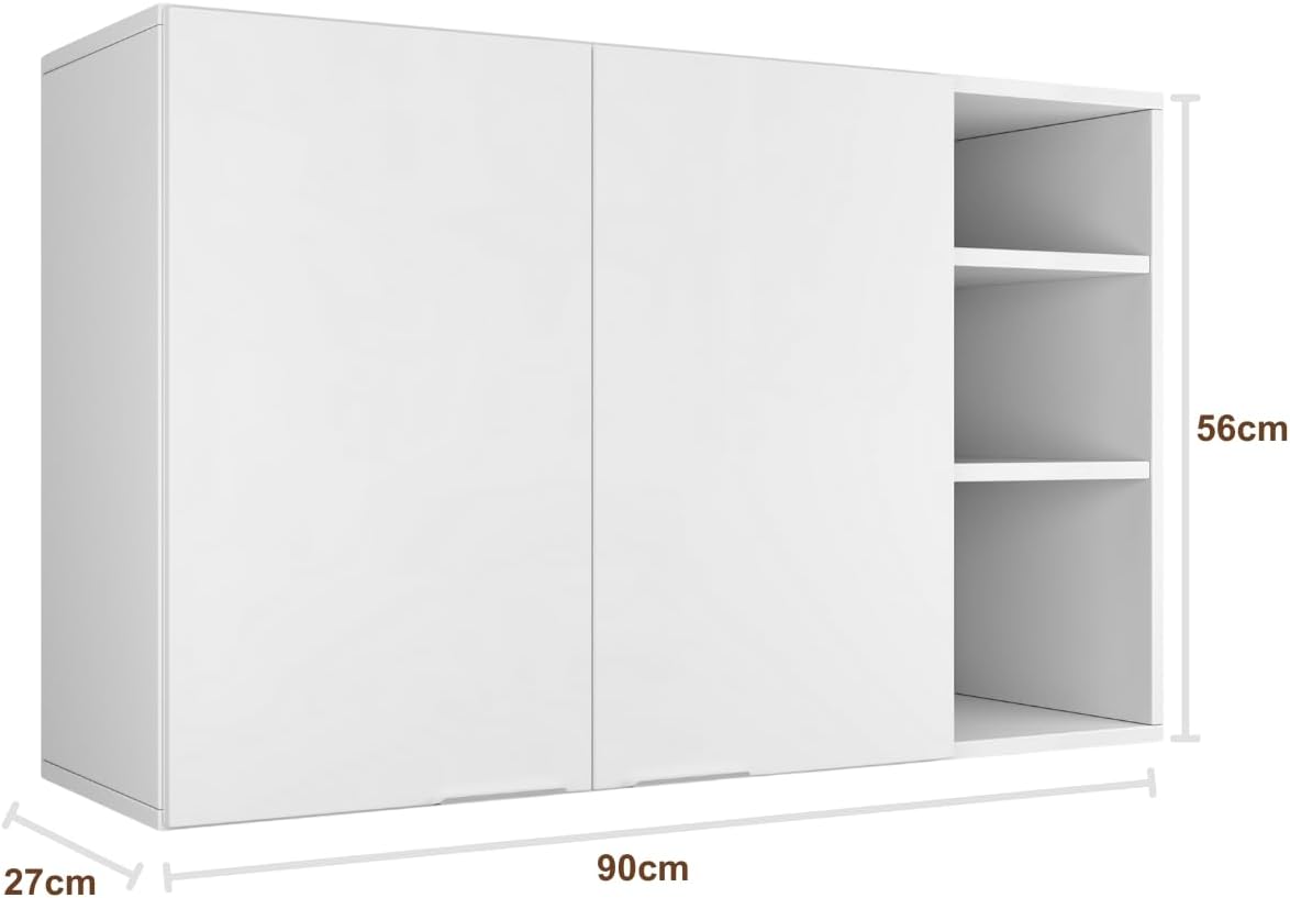 O Armário Aéreo Ópera possui dimensões totais de 90 cm de largura, 56 cm de altura e 27 cm de profundidade, proporcionando um encaixe preciso em paredes. Com peso aproximado de 2 kg, sua estrutura é fabricada 100% em MDP de alta resistência, garantindo segurança e estabilidade após a instalação correta.