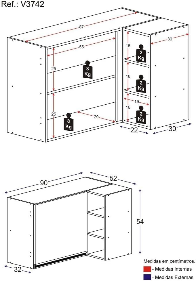A montagem do móvel é necessária e recomenda-se seguir rigorosamente as instruções do manual incluso. Certifique-se de que a parede de instalação possui capacidade de carga suficiente para sustentar o peso do armário e conteúdo interno.