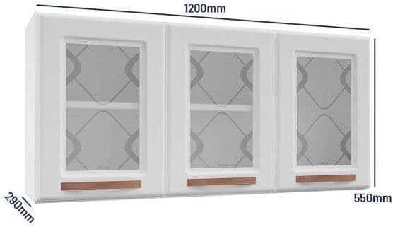 Este armário possui dimensões totais de 120 cm de largura, 55 cm de altura e 29 cm de profundidade, pesando 15,81 quilogramas. O pacote de envio apresenta medidas de 126,5 cm x 59,5 cm x 7 cm, sendo necessário realizar a montagem do produto no momento da instalação.
