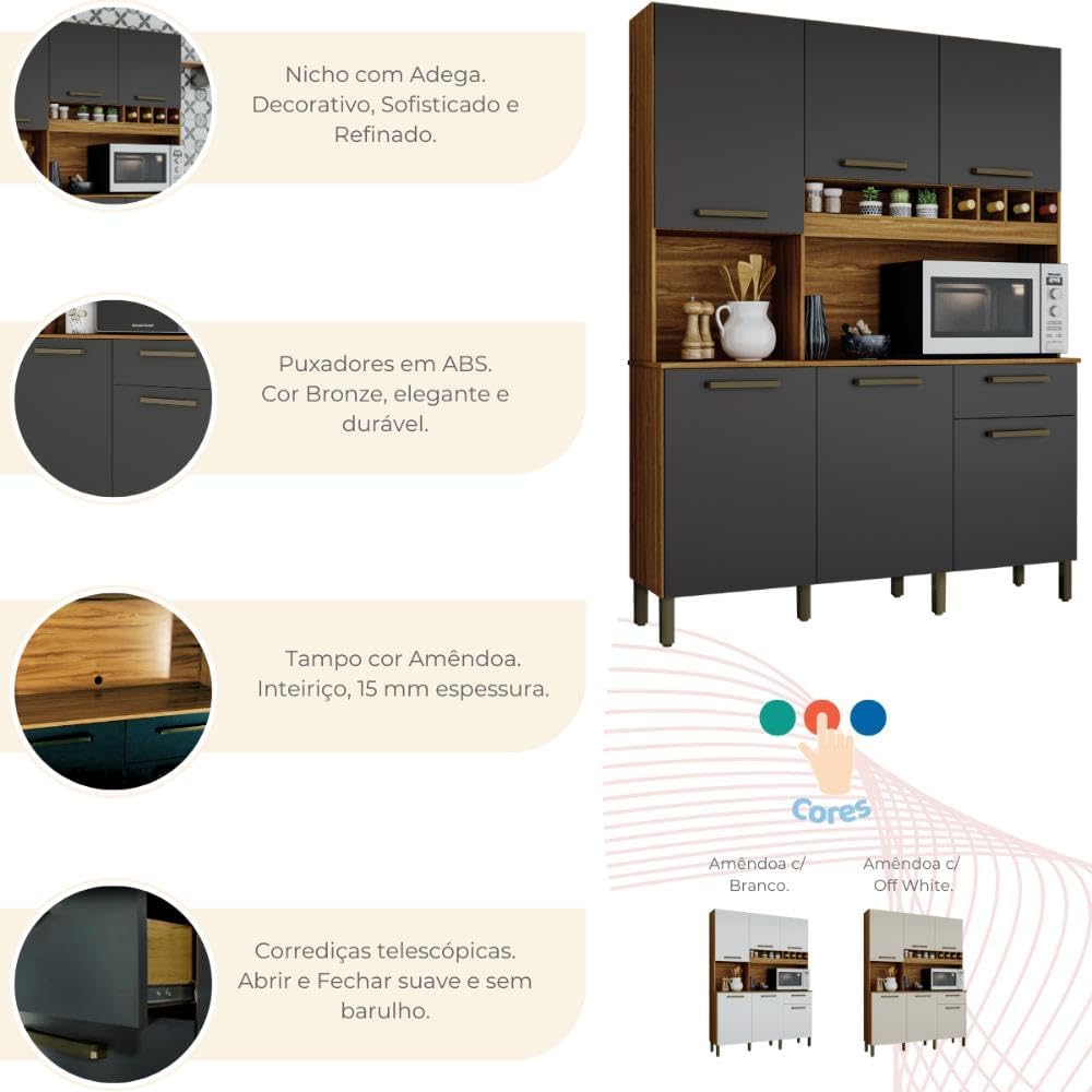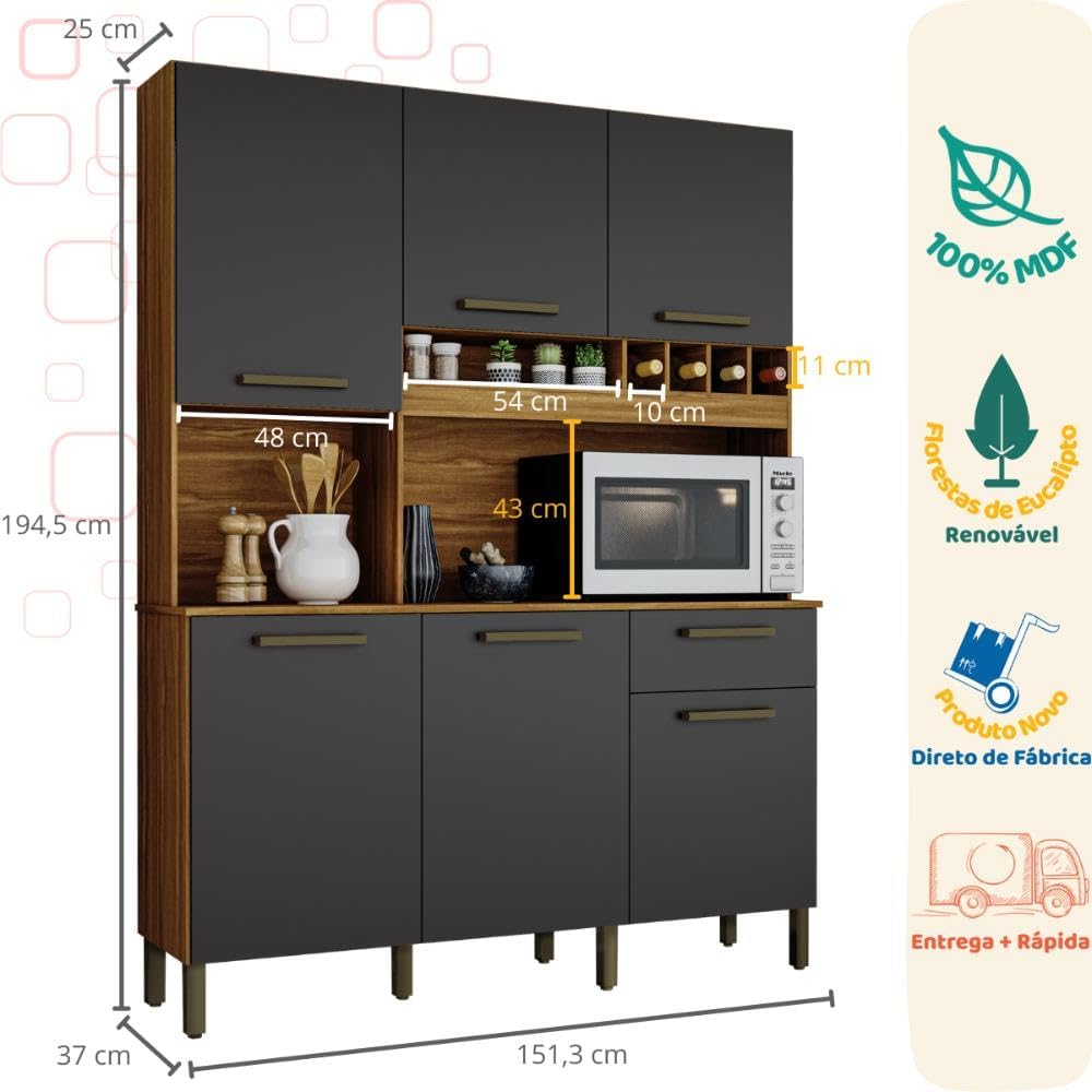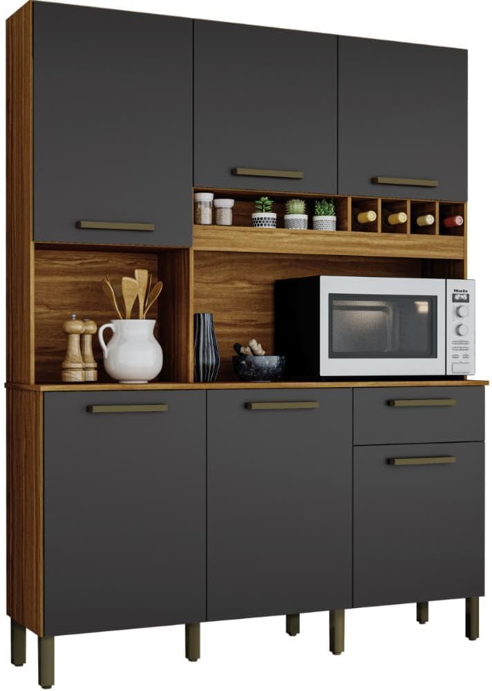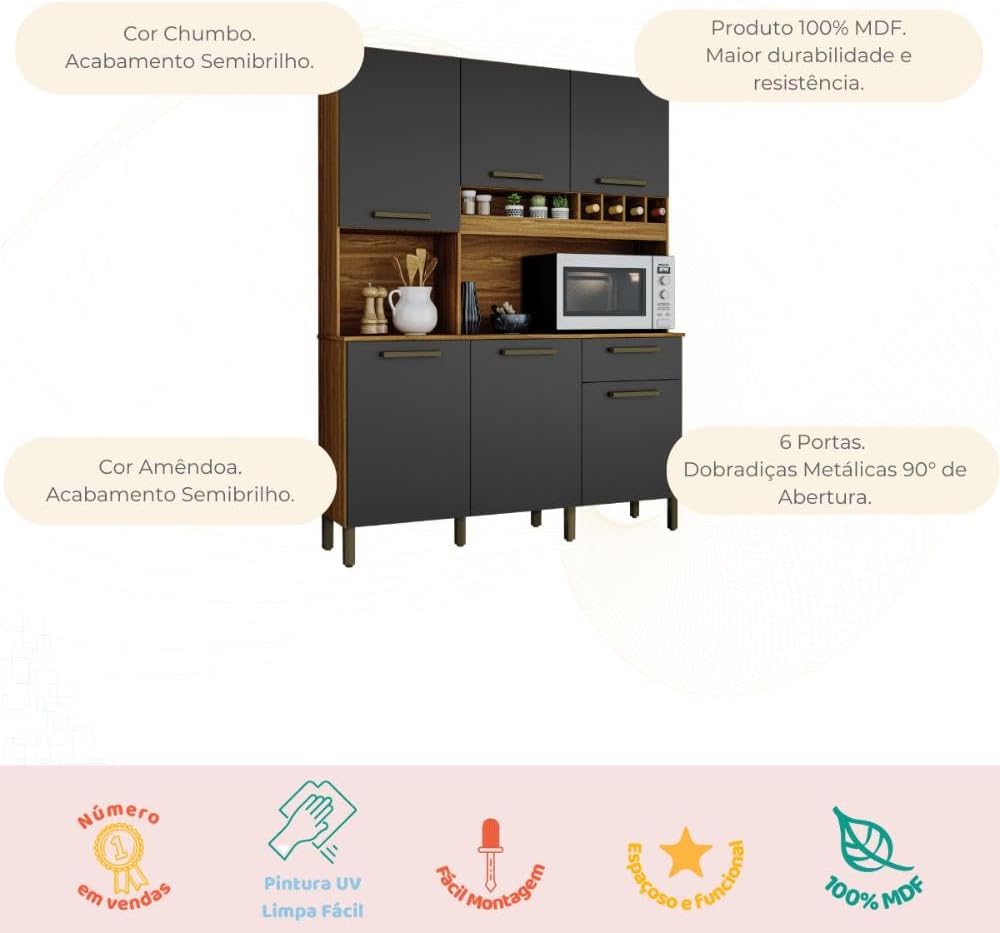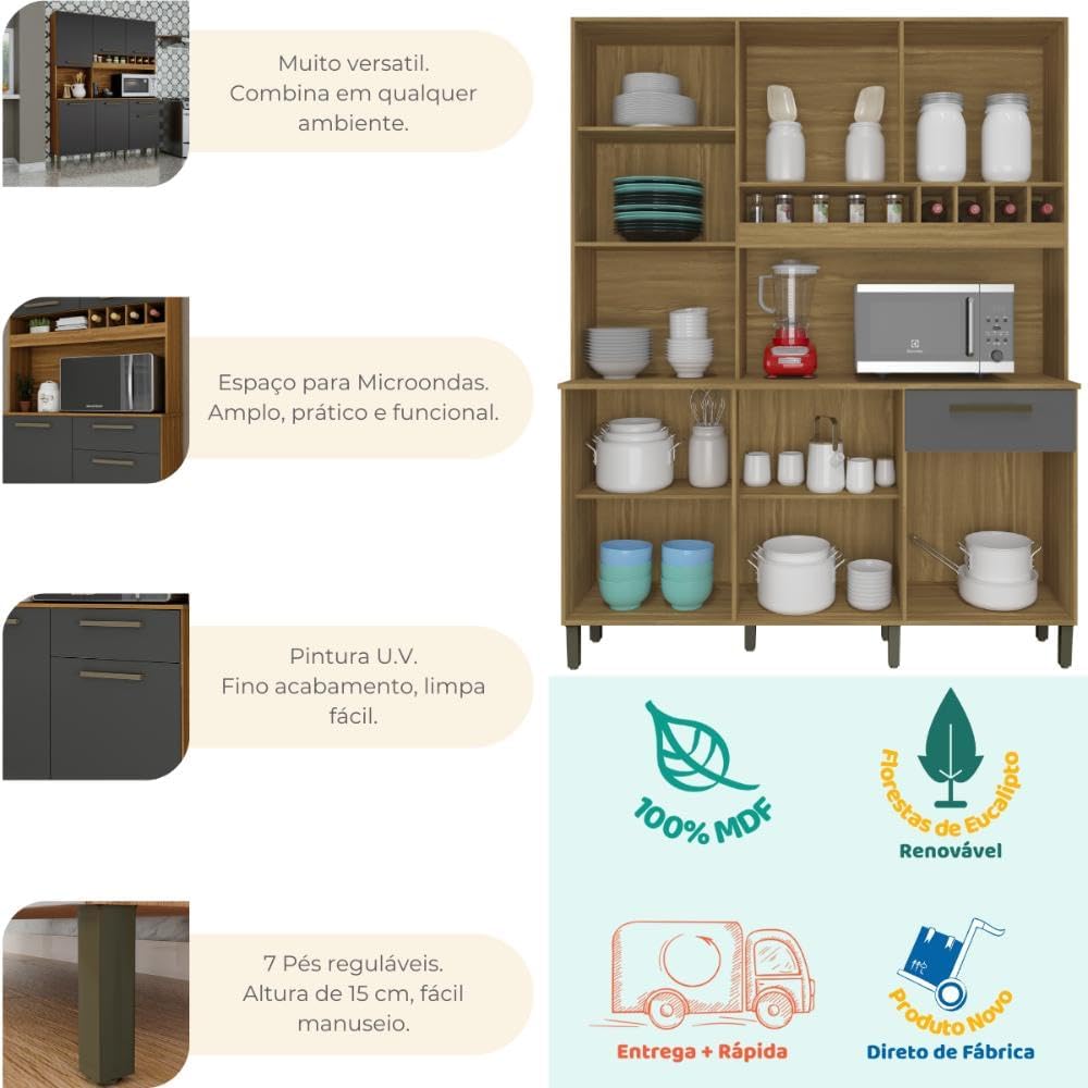 Este armário é indicado para quem deseja uma cozinha organizada e funcional em espaços compactos, sendo um excelente investimento para famílias que buscam um móvel versátil, com nicho para eletrodomésticos e um visual sofisticado para receber visitas com conforto.