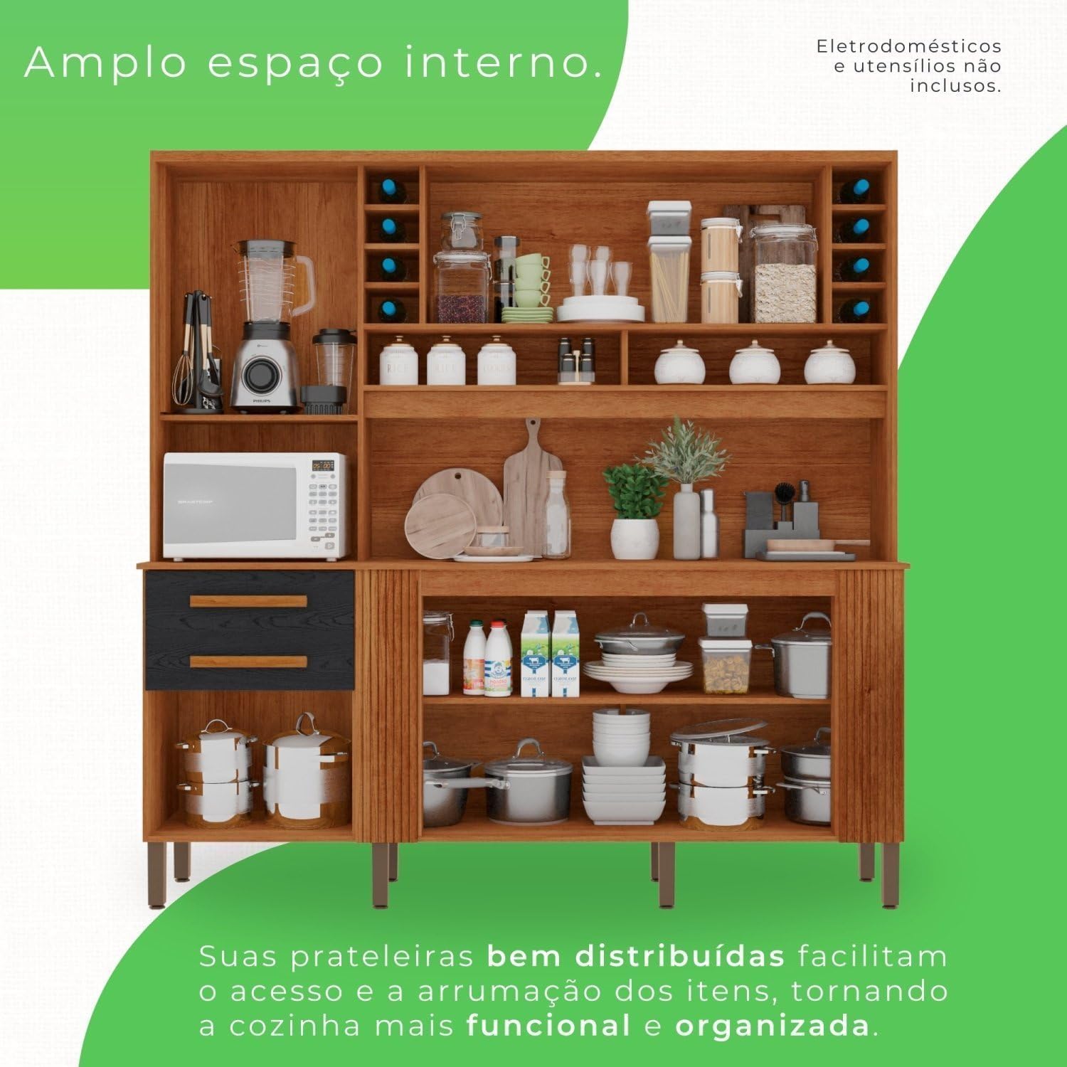 O Armário de Cozinha Catar se destaca pela alta capacidade de armazenamento, oferecendo 6 portas e 2 gavetas espaçosas. A estrutura inclui prateleiras versáteis e nichos dedicados para garrafas, permitindo que você organize utensílios e mantimentos com praticidade e máxima eficiência no seu dia a dia.